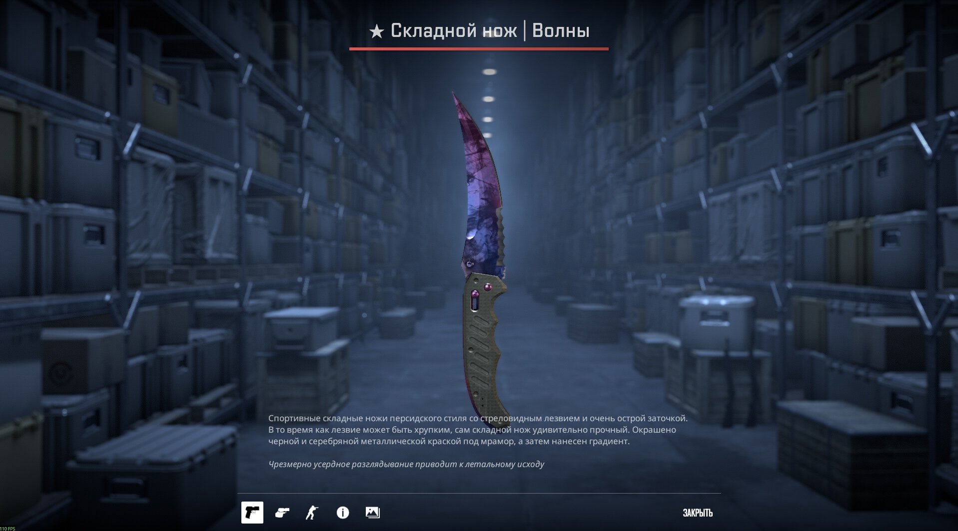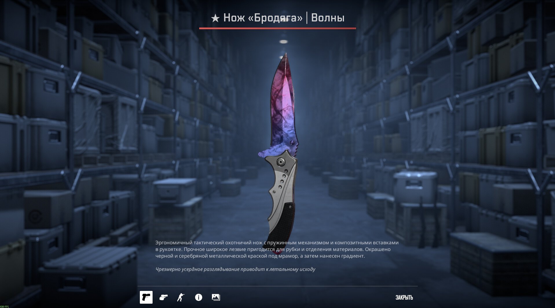 Может, скин и неброский, но разнообразие анимаций точно не позволит вам скучать. А гипнотические переливы на лезвии, возможно, не позволят даже оторваться от скриншота.