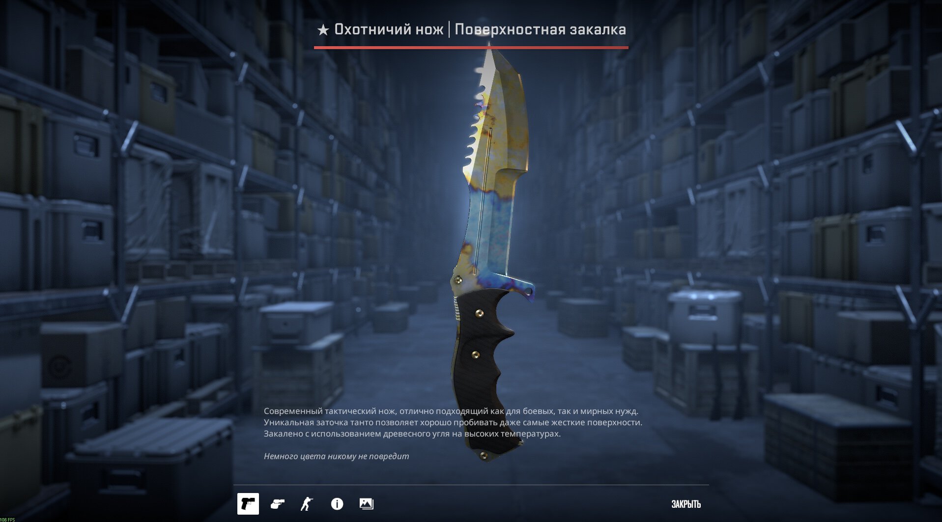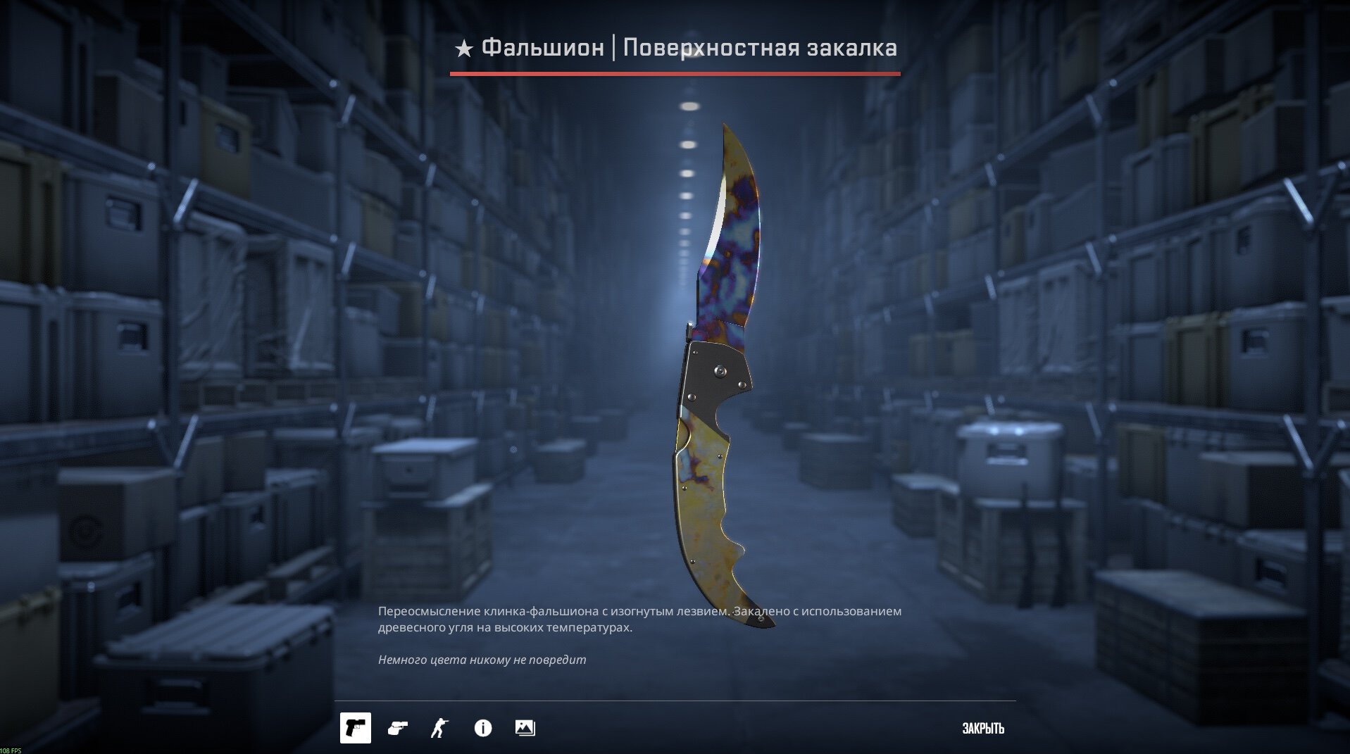 Фальшион привлекает и необычной формой, и интересной анимацией осмотра скина. В данном случае он еще и закален с использованием древесного угля на высоких температурах – а значит, и цена за такой нож должна быть высока.