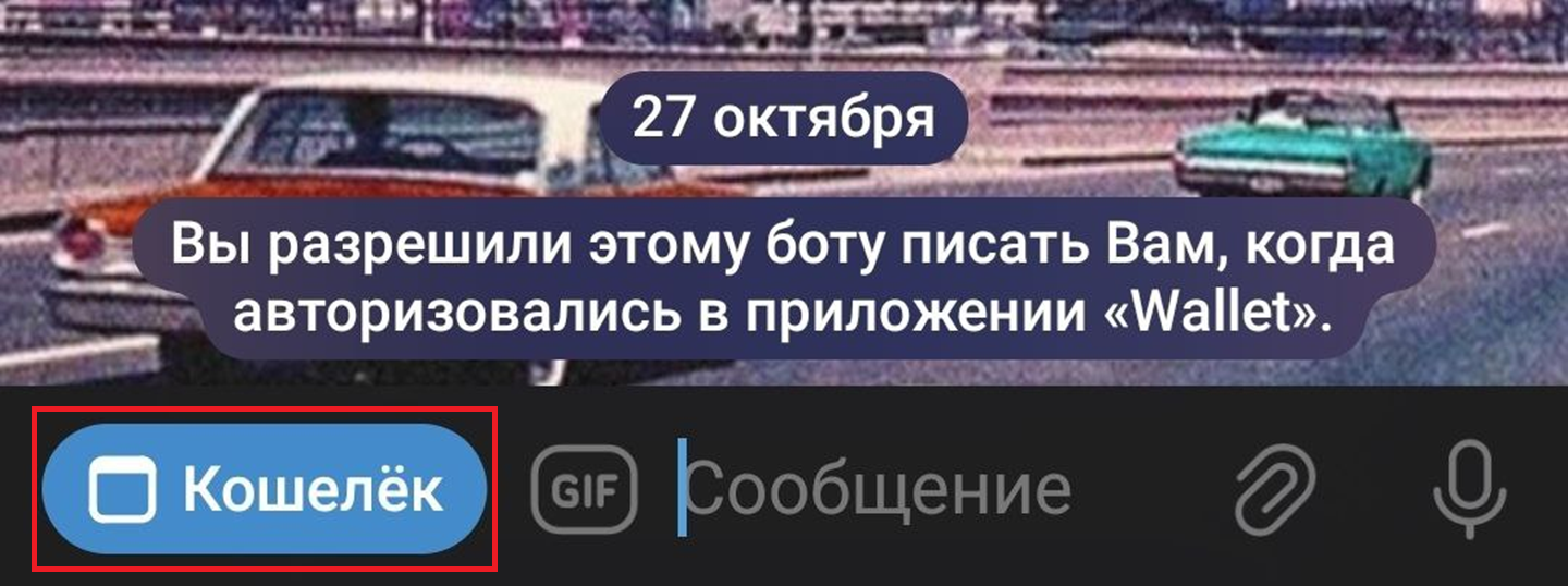 Откройте бота «Кошелек» и нажмите на синюю кнопку «Кошелек» внизу экрана.