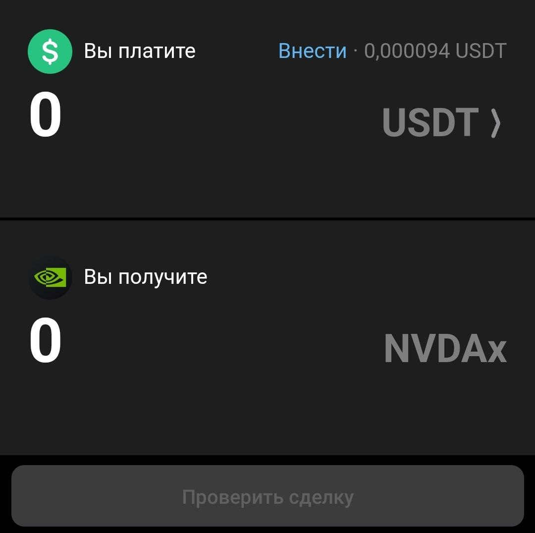Выберите способ оплаты и сумму – сверху вы можете выбрать криптовалюту для оплаты (например, USDT), а также вписать количество токенов, которые вы хотите обменять на акции.