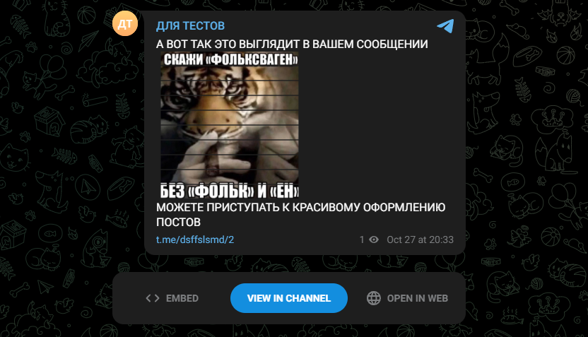 Теперь у вас есть простой инструмент, чтобы делать ваши посты в ТГ-канале красивыми и необычными. Просто найдите подходящую картинку или гифку, и через пару минут вы сможете собрать ее прямо внутри вашего текста, удивляя подписчиков.