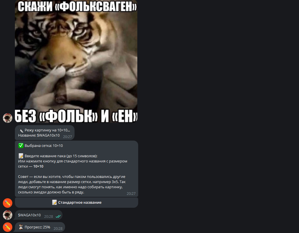 Просто запустите бота, отправьте ему картинку, видео или гифку – он автоматически нарежет их на пакет эмодзи. Дальше из этих эмодзи вы можете собрать исходное изображение в любом посте, как из пазлов.