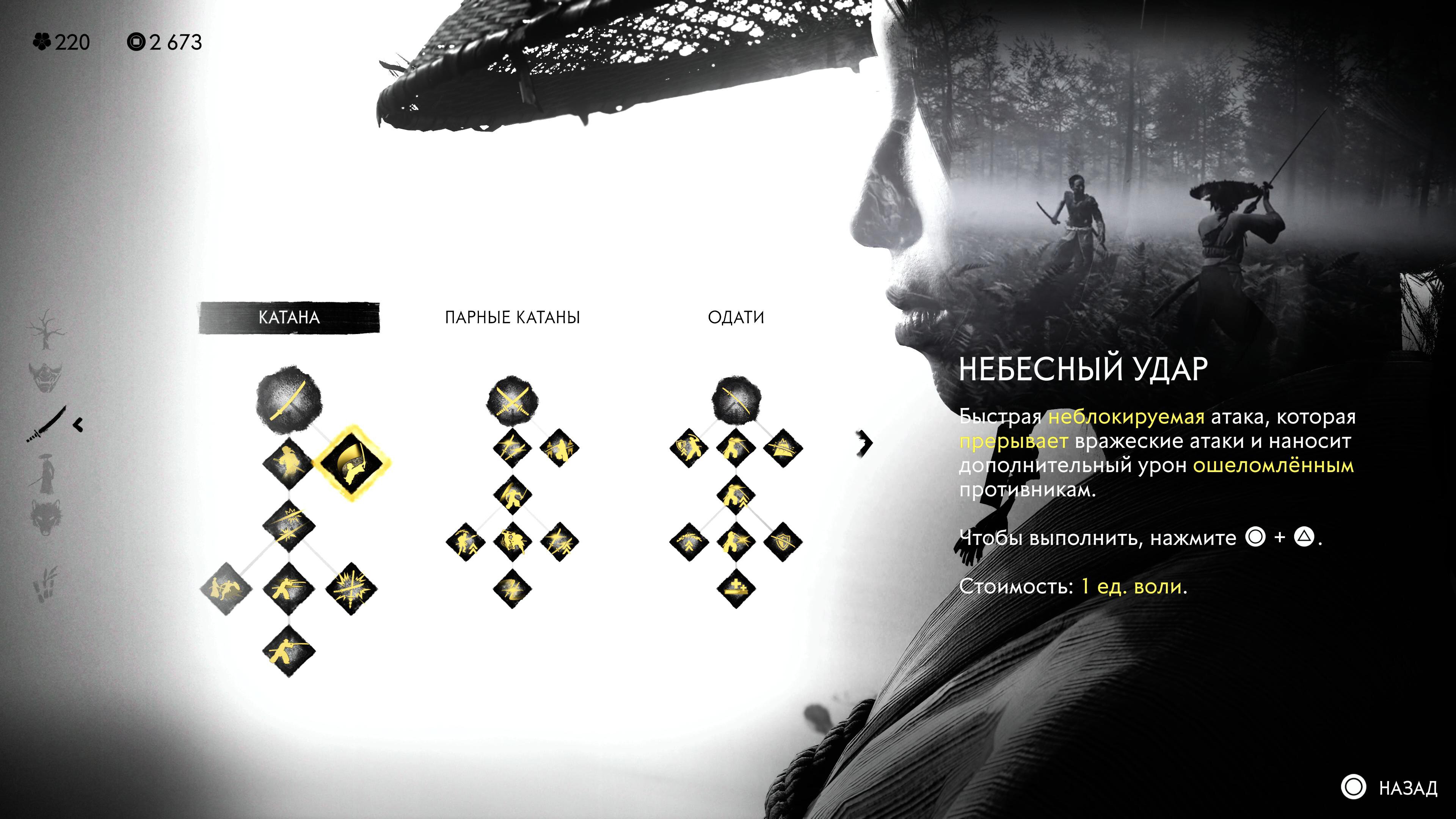 Катана будет вашим основным оружием до конца игры. С самого начала вам доступен один из ее лучших приемов – Небесный удар. В любой момент можно зажать круг и треугольник, после чего Ацу выполнит неблокируемую атаку, которая ошеломляет противника и прерывает его удар. Еще одно преимущество – большая дальность удара: героиня совершает рывок к цели, поэтому промахнуться «Небесным ударом» практически невозможно. Стоимость этой ультимативной способности – всего 1 единица воли.