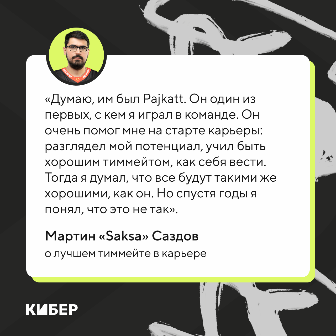Pajkatt, потому что он один из первых, с кем я играл в команде. Он очень помог мне на старте карьеры: разглядел мой потенциал, учил быть хорошим тиммейтом, как себя вести. Честно говоря, тогда я думал, что все будут такими же хорошими, как он. Но спустя годы я понял, что это не так. Pajkatt знал, как быть хорошим тиммейтом и хорошим человеком.