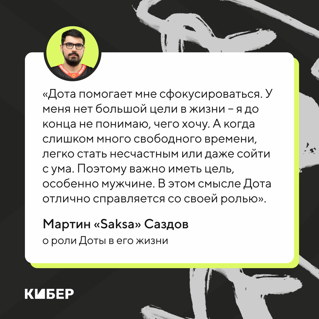 – Дота помогает мне сфокусироваться. У меня нет какой-то большой цели в жизни – я до конца не понимаю, чего хочу. А когда слишком много свободного времени, легко стать несчастным или даже сойти с ума. Поэтому важно иметь цель в жизни, особенно мужчине. В этом смысле Дота отлично справляется со своей ролью.