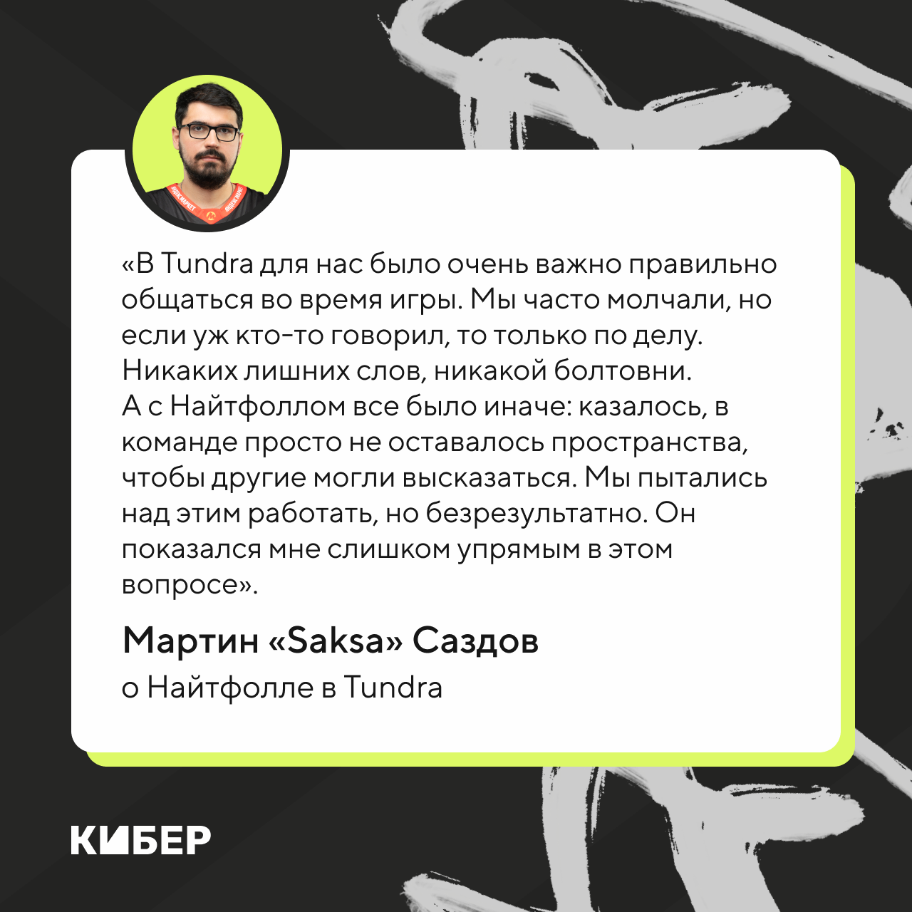 Например, в Tundra для нас было очень важно правильно общаться во время игры. Мы часто молчали, но если уж кто-то говорил, то только по делу. Никаких лишних слов, никакой болтовни. А с Найтфоллом все было иначе: казалось, в команде просто не оставалось пространства, чтобы другие могли высказаться. Мы пытались над этим работать, но безрезультатно. Он показался мне слишком упрямым в этом вопросе, и я не был уверен, что ситуация улучшится – он просто из тех, кто говорит слишком много. Тогда я и решил, что он нам не подходит.