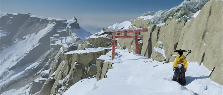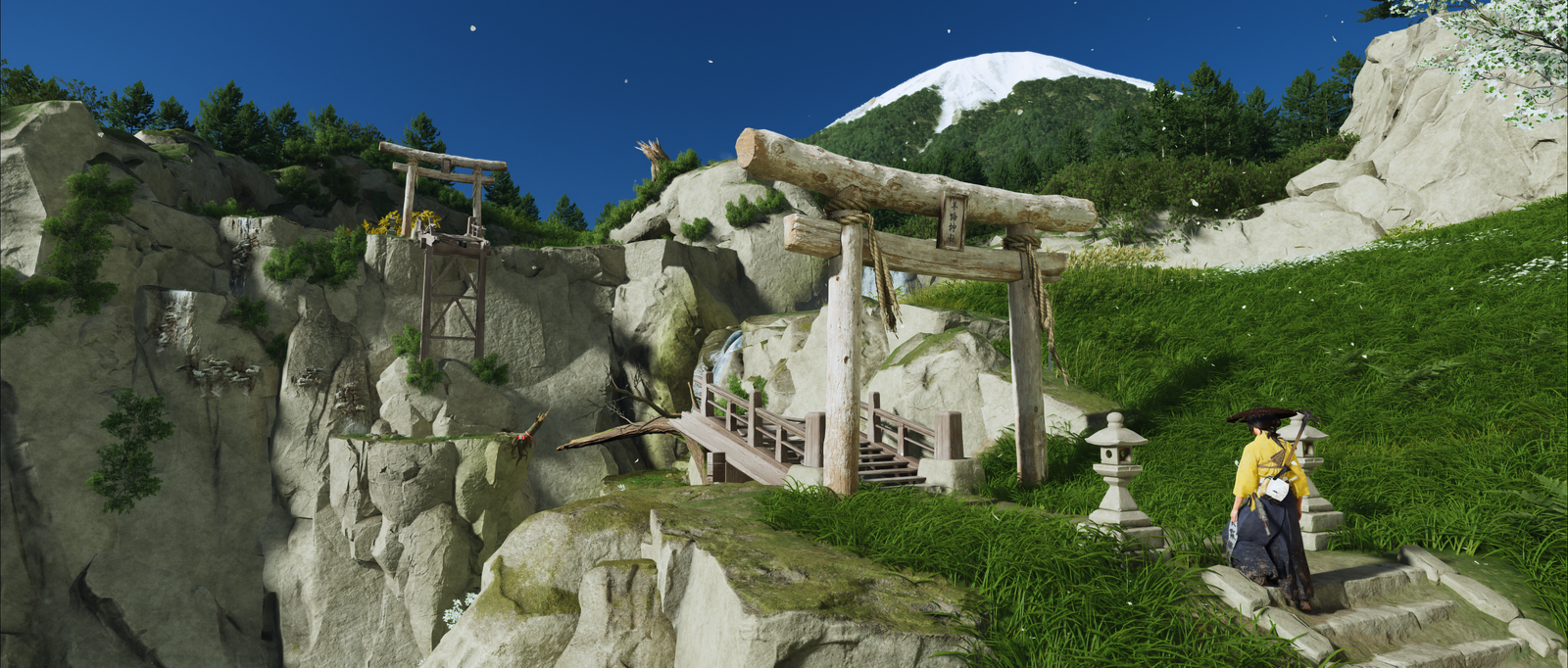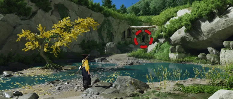 После выхода из пещеры предстоит последний рывок: длинный участок, где нужно цепляться крюком и прыгать между каменными уступами. На вершину вы попадете, когда увидите большой каменный торий и статуи духов, встречающих вас перед святилищем.