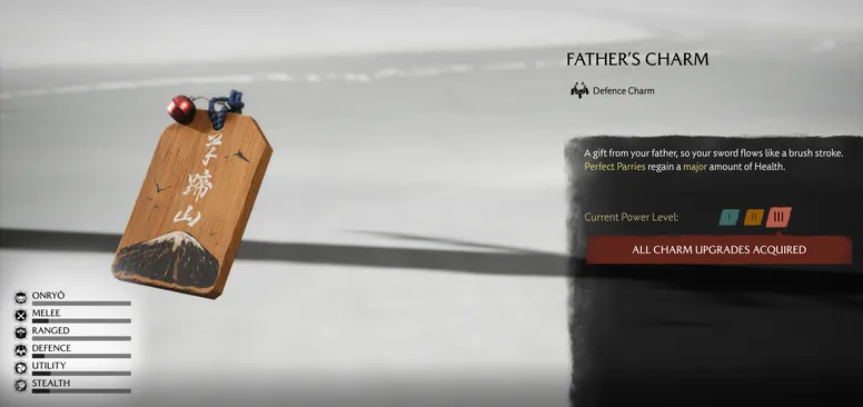 - Отцовский амулет: повышает силу атаки в ближнем бою на 10% и восстанавливает небольшое количество здоровья при идеальном парировании.