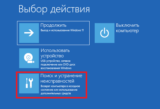 После перезагрузки откроется среда восстановления Windows 11. Нажмите «Поиск и устранение неисправностей».