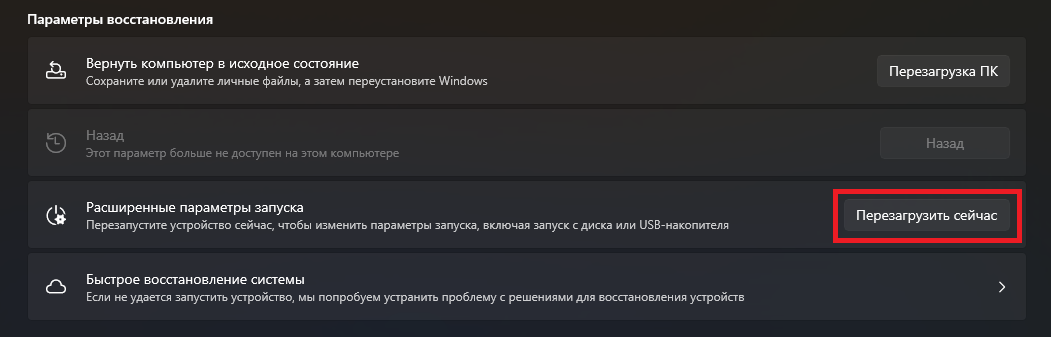 В разделе «Параметры восстановления» в пункте «Расширенные параметры запуска» нажмите кнопку «Перезагрузить сейчас» и подтвердите перезапуск устройства.