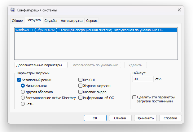 В разделе «Параметры загрузки» отметьте галочку «Безопасный режим». Если вам требуется поддержка сети, выберите пункт «Сеть» (в остальных случаях обычно подходит «Минимальная»).