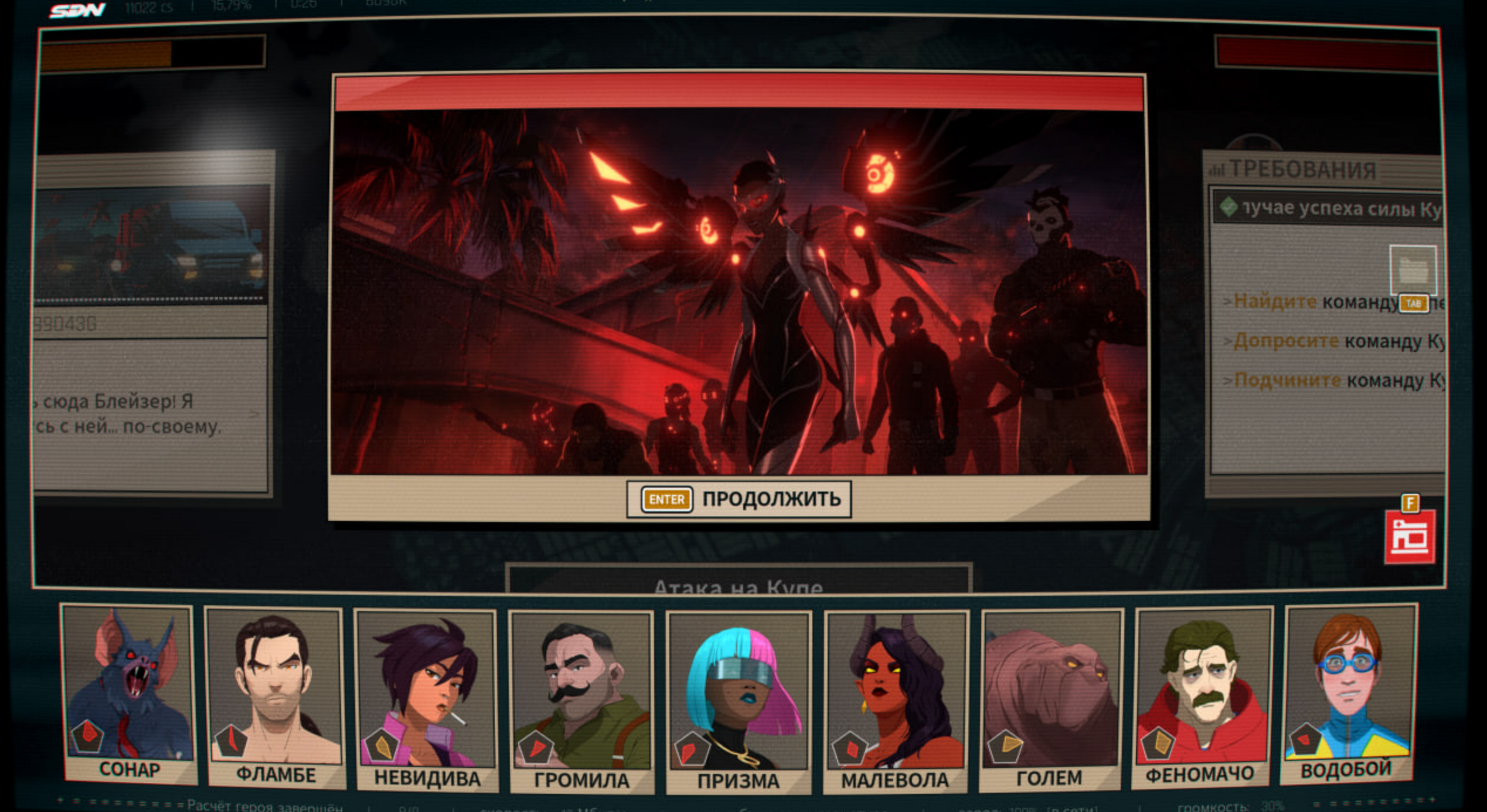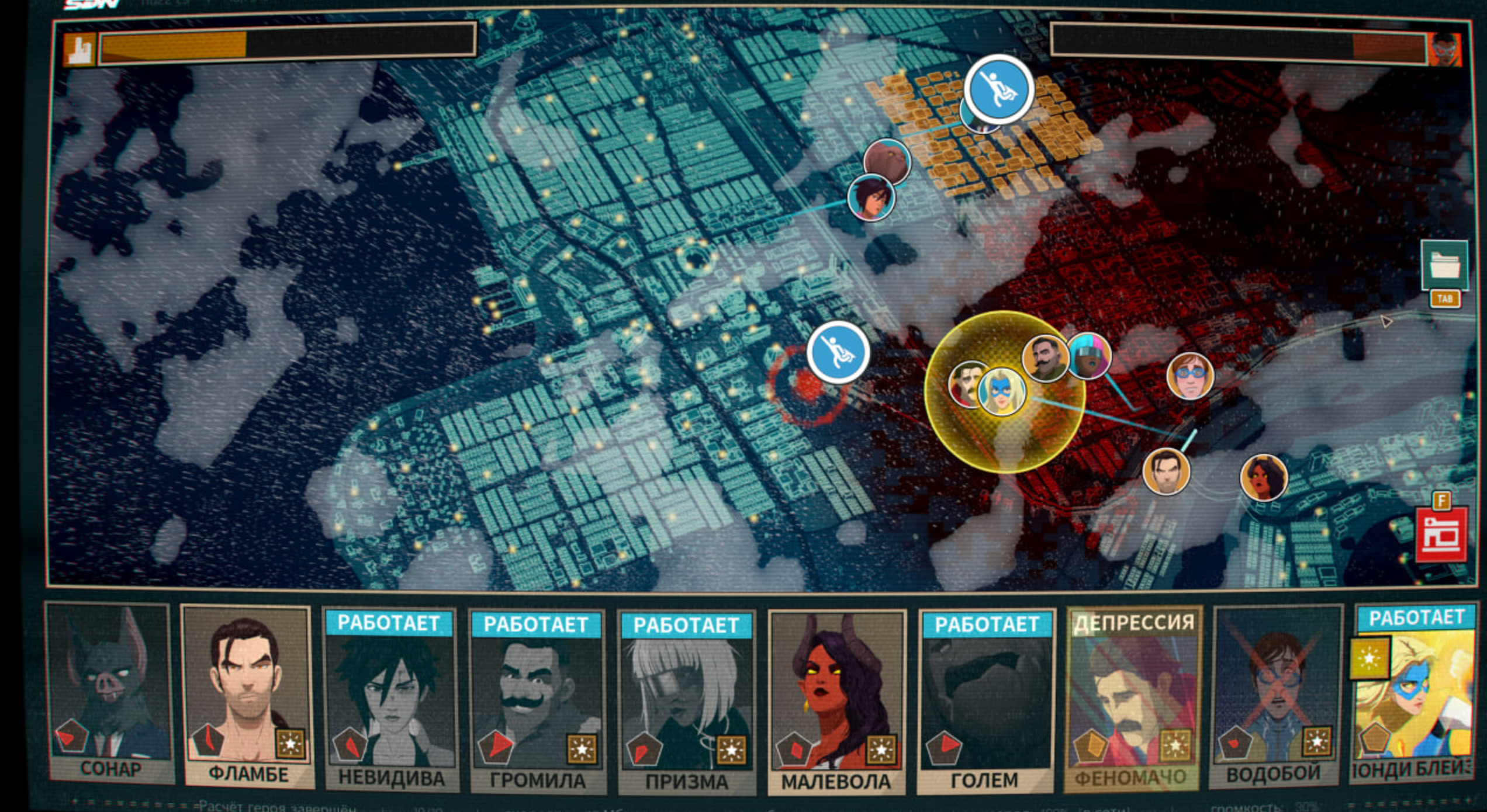 Смена будет длиться долго. Слева в углу появится шкала разрушений города – провал заданий будет уменьшать полоску. Постепенно появится возможность не только вернуть в отряд всех героев, но и пополнить команду недостающим Водобоем или Феномачо.