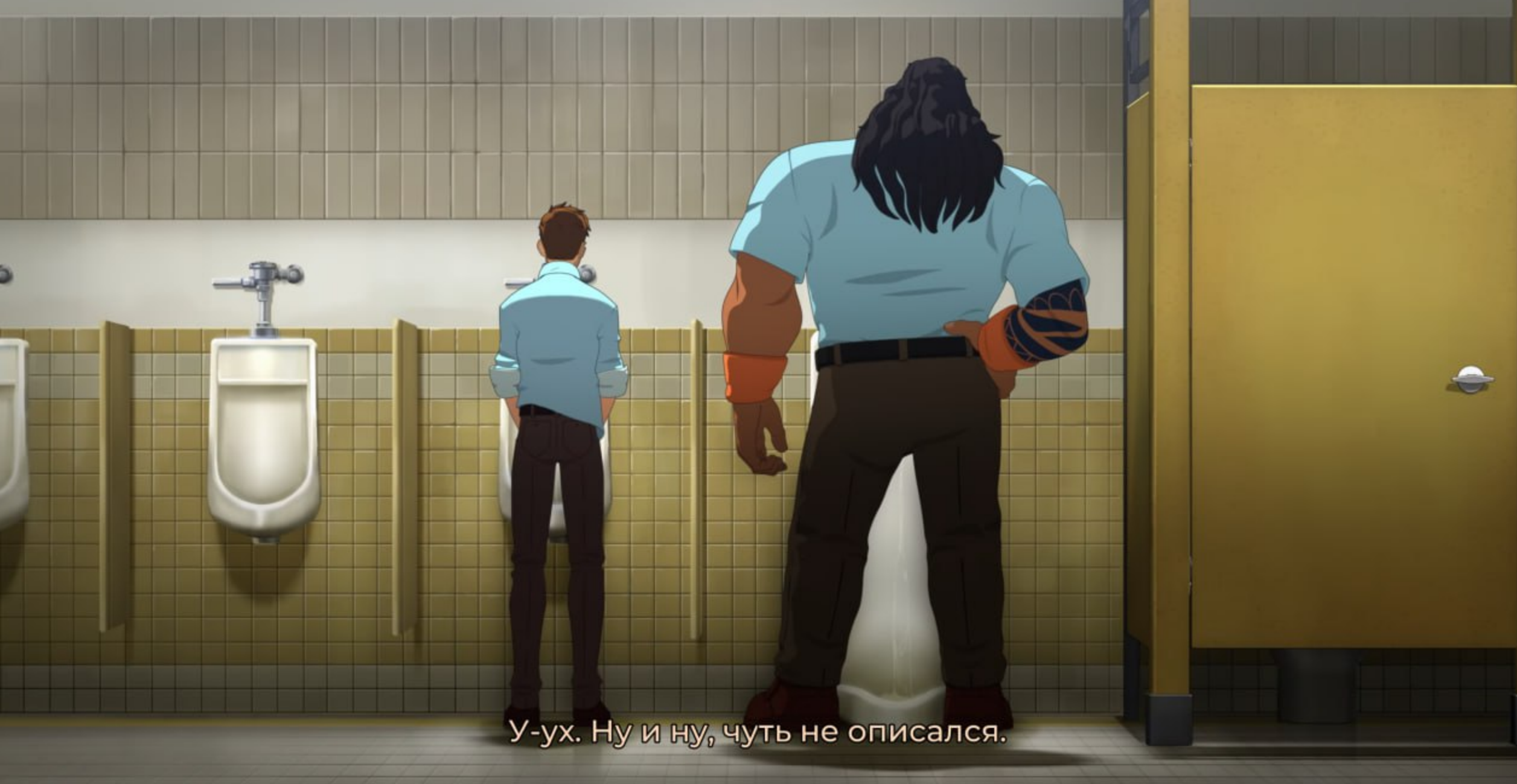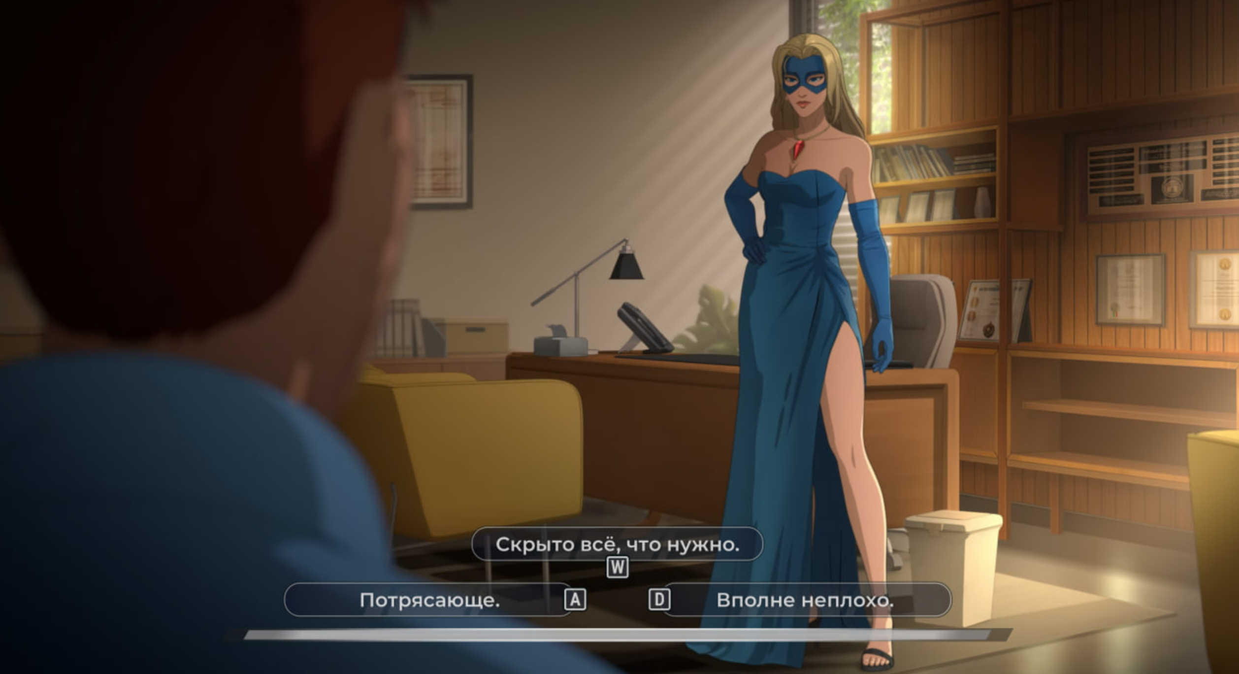 Если вы ее развязали, то появится мемный диалог. Пара победит злодея, который мочился на фикус – теперь он лежит с голым причиндалом. Роберт и Невидива решат, что выглядит это ужасно, поэтому начнут спорить, кто уберет его пенис обратно в штаны. В этом диалоге не могу вас ограничивать – выбирайте сердцем!