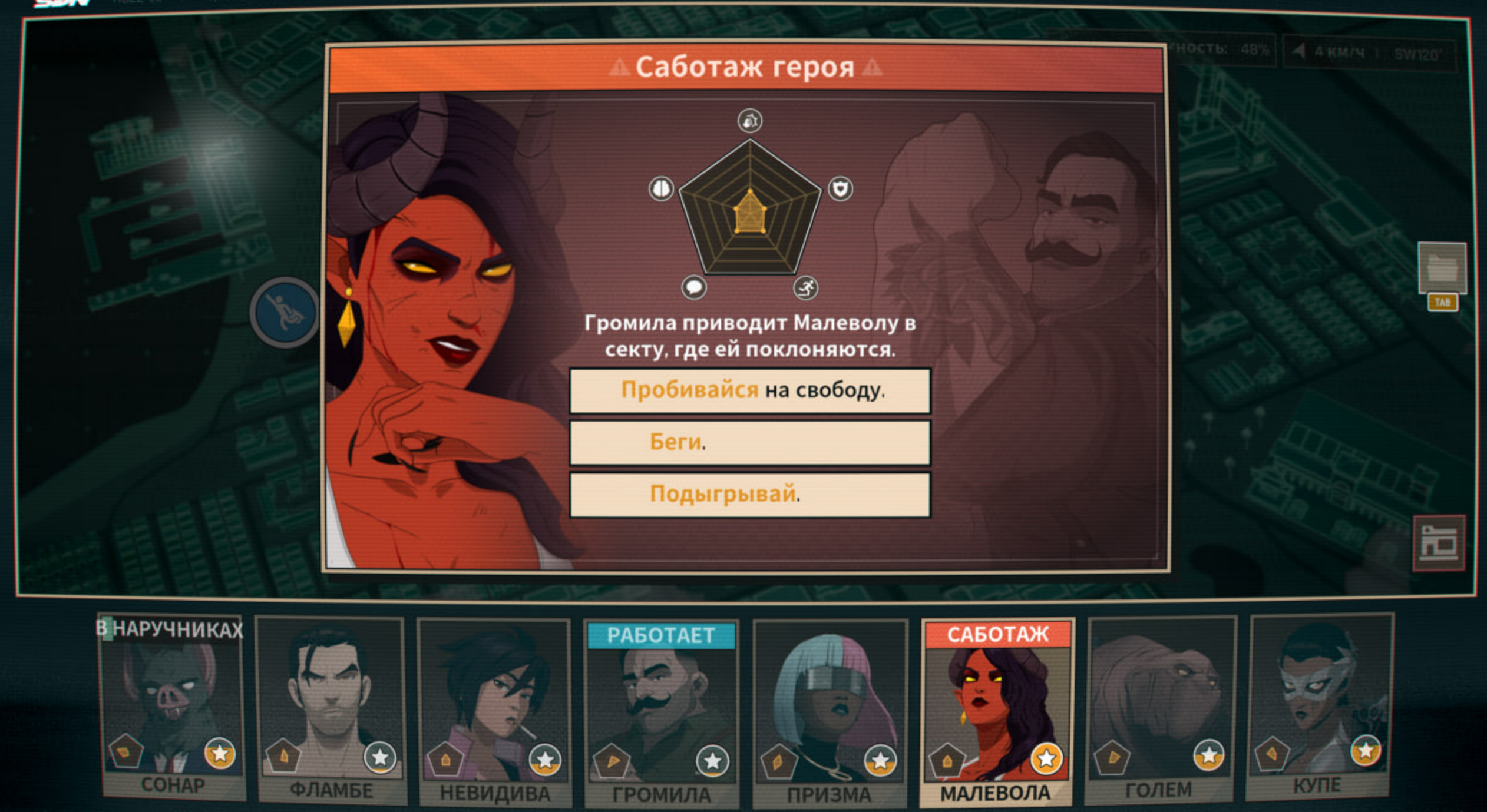 Затем все члены команды узнают, что один из них будет исключен, поэтому на совместных заданиях будут мешать друг другу. Игра будет подкидывать вопросы, чтобы избежать саботажа. Угадаете – лишний персонаж просто вернется на базу, не угадаете – подопечный получит травму или расстроится. Поэтому лишний раз подумайте, стоит ли отправлять на задание двоих работяг.