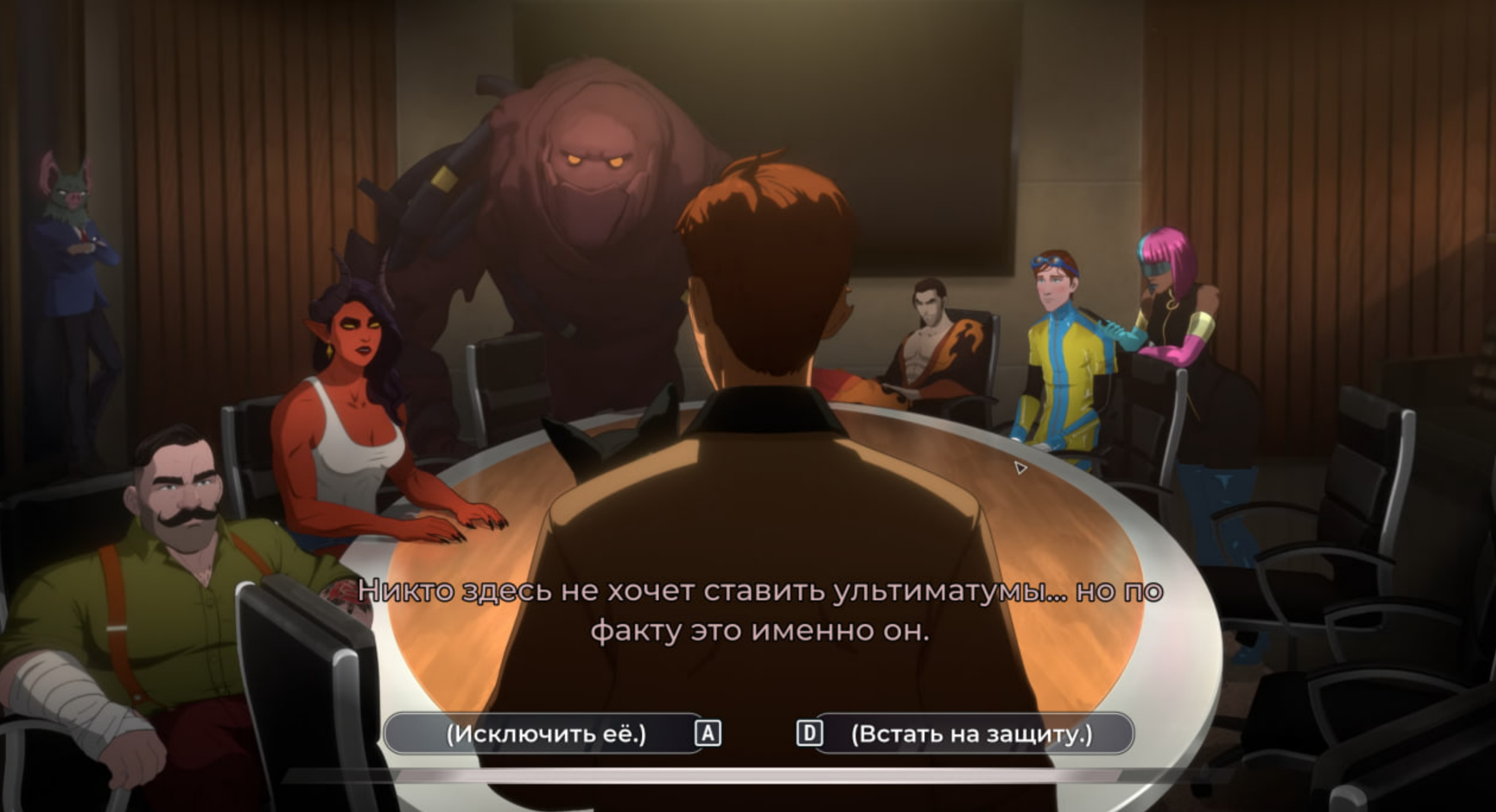 Затем вы узнаете, что команда возмущена поступком Невидивы и требует ее исключить. Против выступает лишь Голем. Выбрать нужно прямо сейчас – это серьезно отразится на сюжете и настроении команды: