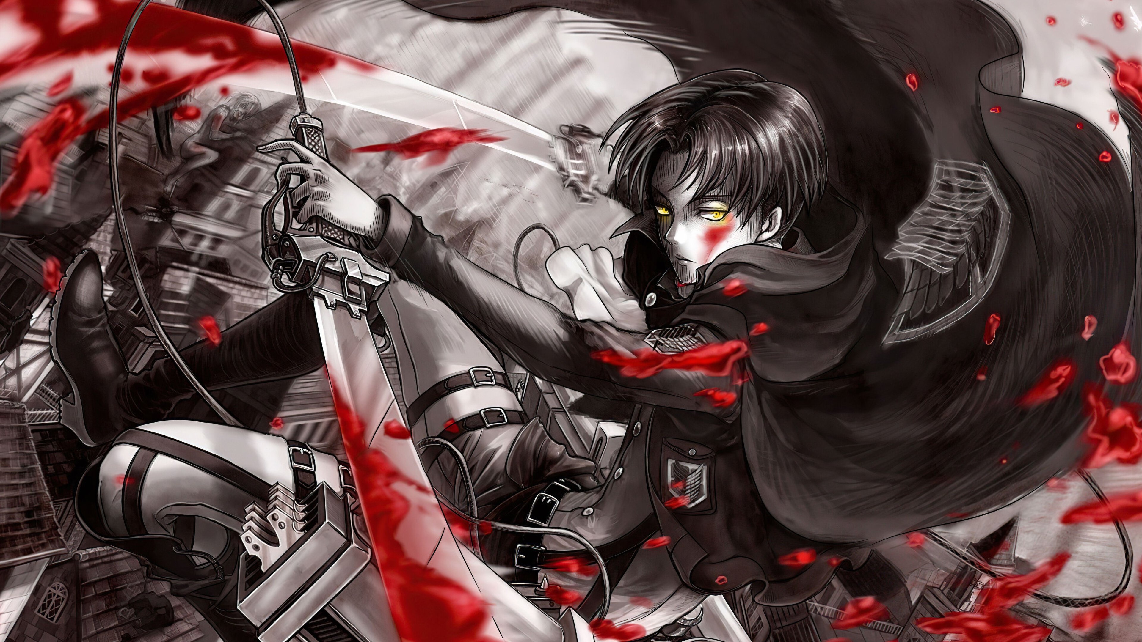 В нашей подборке – обои с Эреном, Армином, Микасой, Леви, титанами и другими известными героями аниме. Большинство обоев 4K, они подойдут многим мониторам, у которых разрешение 16:9.