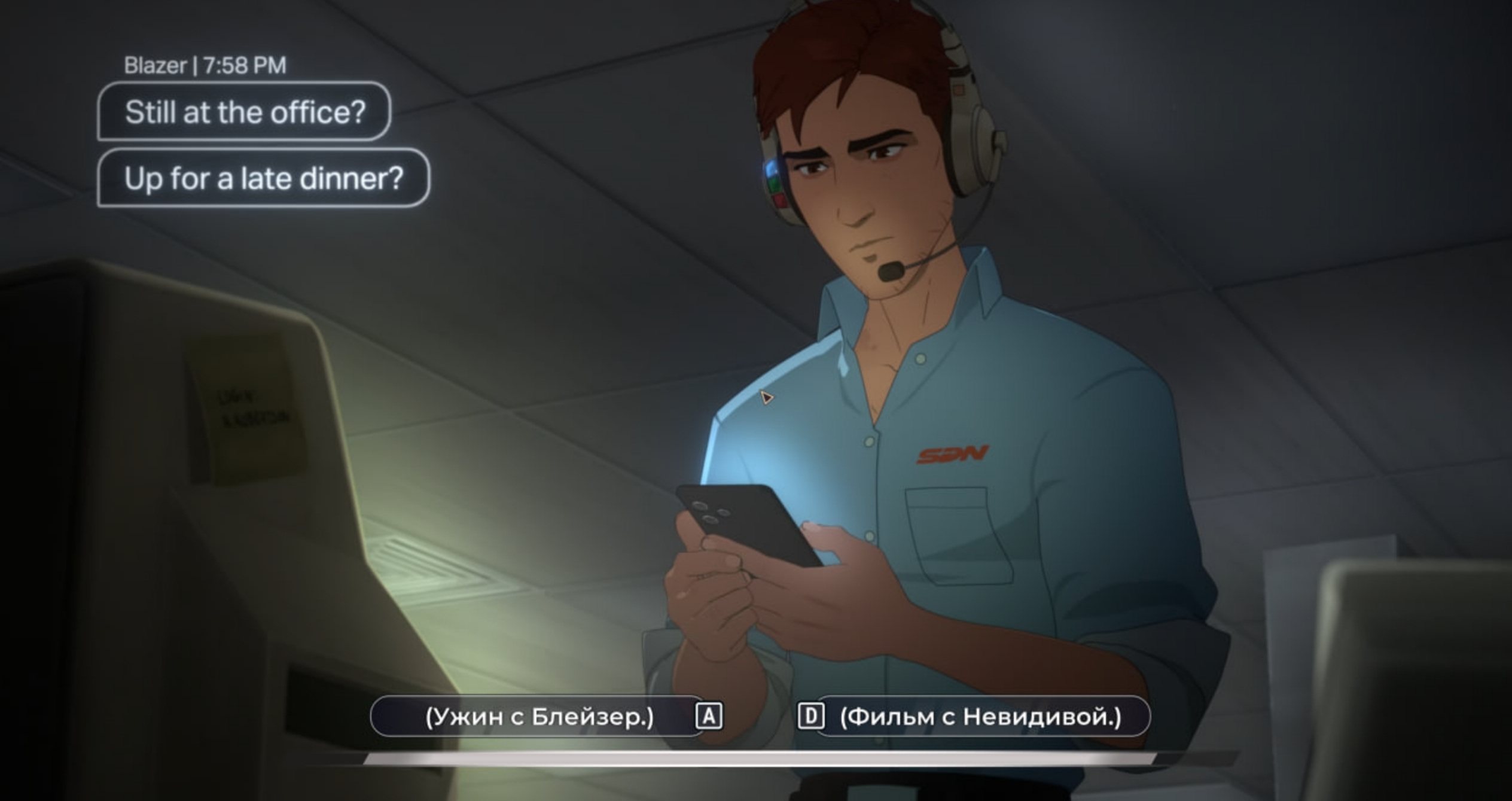 Тем сложнее выбор в финале эпизода! В конце смены Роберт готовится идти домой, но по датчикам замечает Невидиву в кинотеатре – она смотрит романтическую комедию. Мехамэн выходит с ней на связь, мило общается и даже готовится составить компанию. Но в этот момент приходит сообщение от Блейзер – эффектная блондинка приглашает на ужин!
