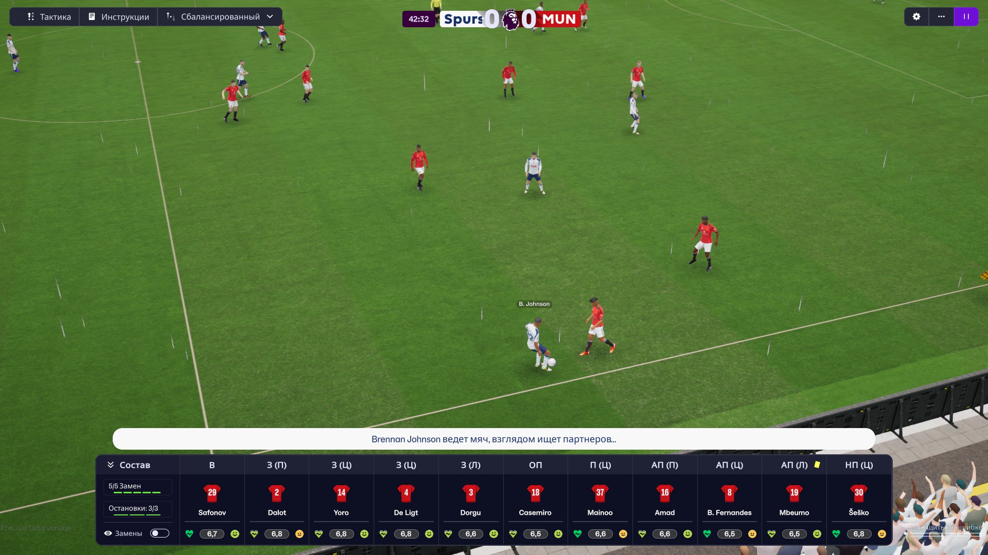 Общение с командой тоже не исправили. Диалоги усиливают реалистичные ощущения управления коллективом, но им часто не хватает логичности. Например, я решил продать 33-летнего бразильца Каземиро, который терял скиллы и откусывал 350 тысяч евро в неделю из зарплатной ведомости. Ответ команды, что называется, убил. Ко мне пришел капитан Бруну Фернандеш и заявил, что деньги и уровень игры не имеют значения, ведь Каземиро важен в раздевалке.