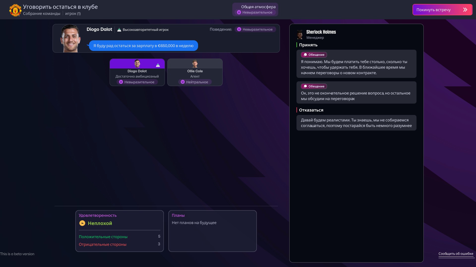 Другая забавная ситуация случилась с Диогу Далотом. В начале сезона португалец запросил (и получил) новый контракт, но уже зимой поставил ультиматум о переходе в саудовскую лигу. Никакие доводы о целях команды или важности авторитета игрока не сработали. Похожий номер выкинул ассистент менеджера, который ежедневно помогал мне с клубом. Ну, и где здесь реализм?