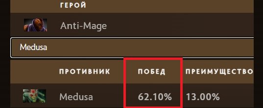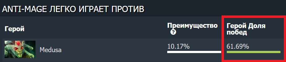 Медуза против Антимага – один из классических керри-матчапов Доты и один из самых полярных. Как правило, для АМ’а это всегда «фришка», а для Дузы – невозможная игра. Статистика подтверждает: Антимаг выигрывает у Медузы чудовищные 62% матчей в нынешней мете. Классика для концептуального контрпика!