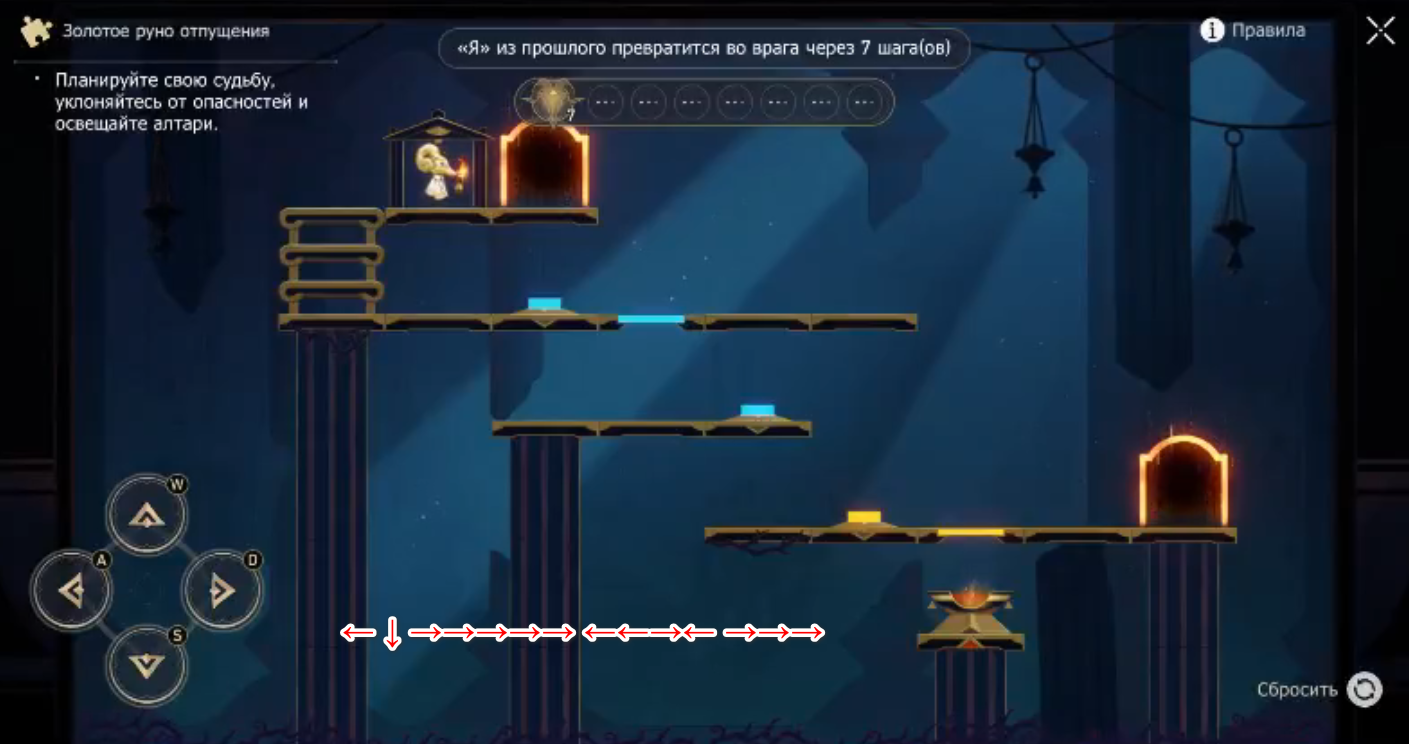 Приблизьтесь к запертому порталу, а после этого направляйтесь обратно к вратам. Продвигайтесь максимально вправо, затем спуститесь по левому склону и проникните в портал. Переместитесь, прыгнув через появившуюся синюю плитку, чтобы добраться до следующего переходного пункта. Сперва сделайте шаг в правую сторону, затем проникните в помещение и устремитесь к алтарю – дух не сможет вас настигнуть