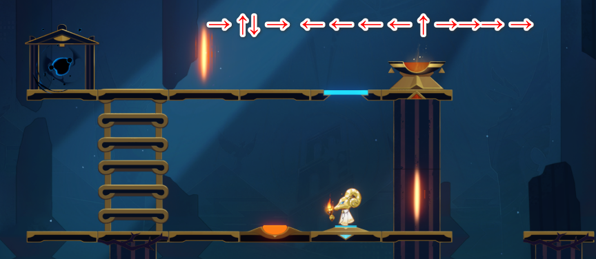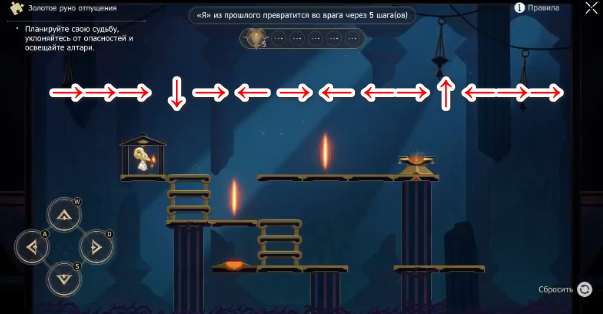 Отойдите немного вправо от края платформы, затем спрыгните и спуститесь вниз по лестнице. Необходимо выполнить 2 цикла движений, смещаясь поочередно влево и вправо, после чего занять позицию на оранжевой кнопке – это активирует порталы. Преодолейте лестничный подъем, проникните в открывшийся проход и устремитесь к священному алтарю – лишь так вы сможете пройти испытание до конца.