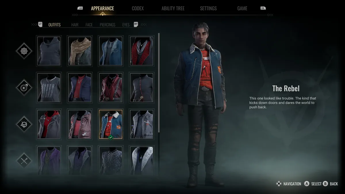 Бунтарь (The Rebel) – открывается после способности «Провокация» (Taunt). Классический аутфит дерзкого хулигана: кожаная куртка с цепями, тяжелые сапоги и уверенная осанка. Повышает шансы запугать NPC.