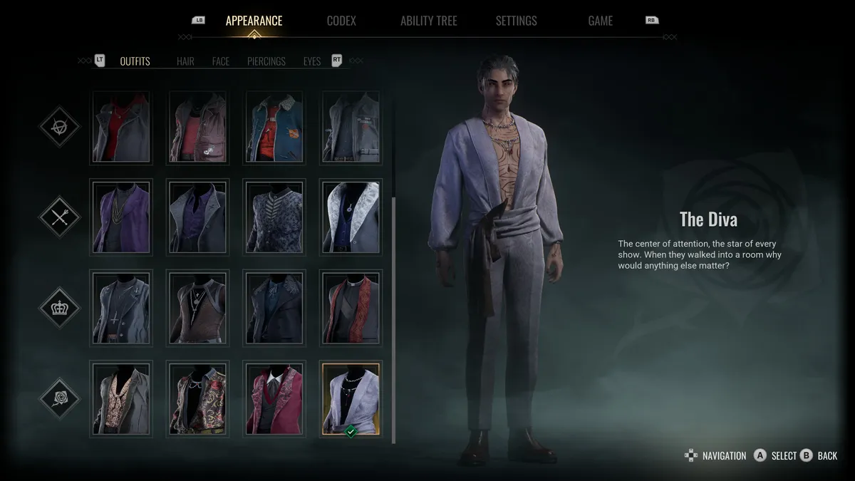 Игрок (The Player) – открывается после способности «Чарующий поцелуй» (Entrancing Kiss). Легкий, изысканный костюм, создающий ауру флирта и притяжения. В нем вы будете особенно убедительны при общении с жертвами с розовой аурой.