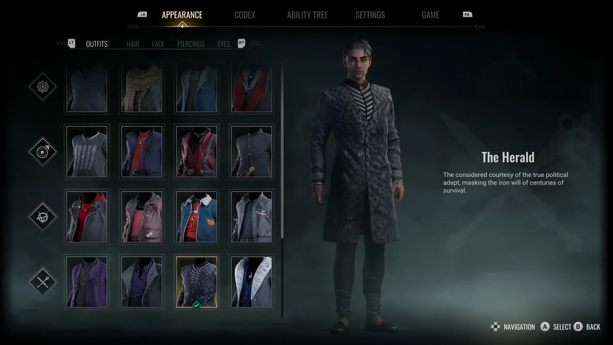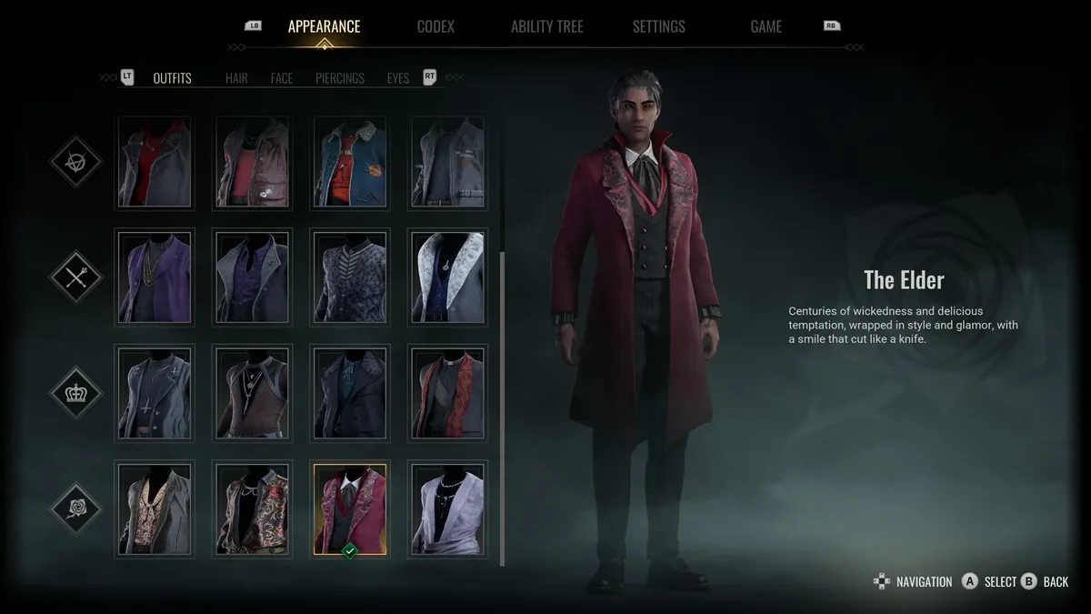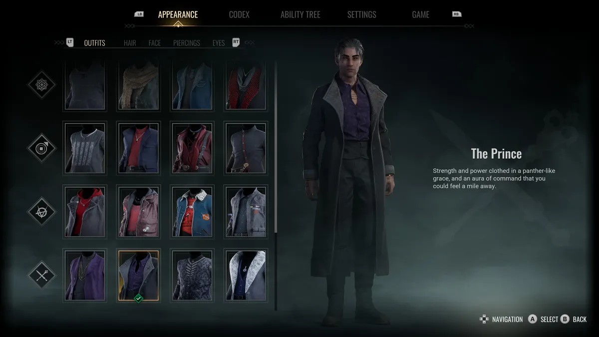 Принц (The Prince) – становится доступен после изучения способности «Контроль» (Possession). Этот аутфит излучает уверенность и превосходство. Подходит для сцен переговоров и встреч с представителями других кланов.