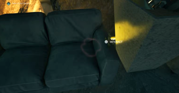 Вернитесь в башню Уивера и поднимитесь на лифте на верхний этаж. Выйдя из лифта, пройдите до конца коридора справа. Вы увидите диван с крестом, торчащим из подлокотника.