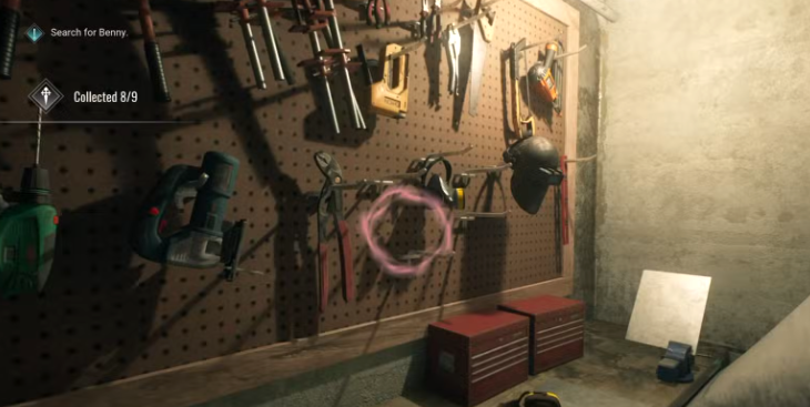 Оказавшись внутри автомастерской, пройдите в заднюю комнату. Здесь вы найдете доску с различными инструментами, висящими на ней. Среди инструментов вы найдете крест, висящий на стене.