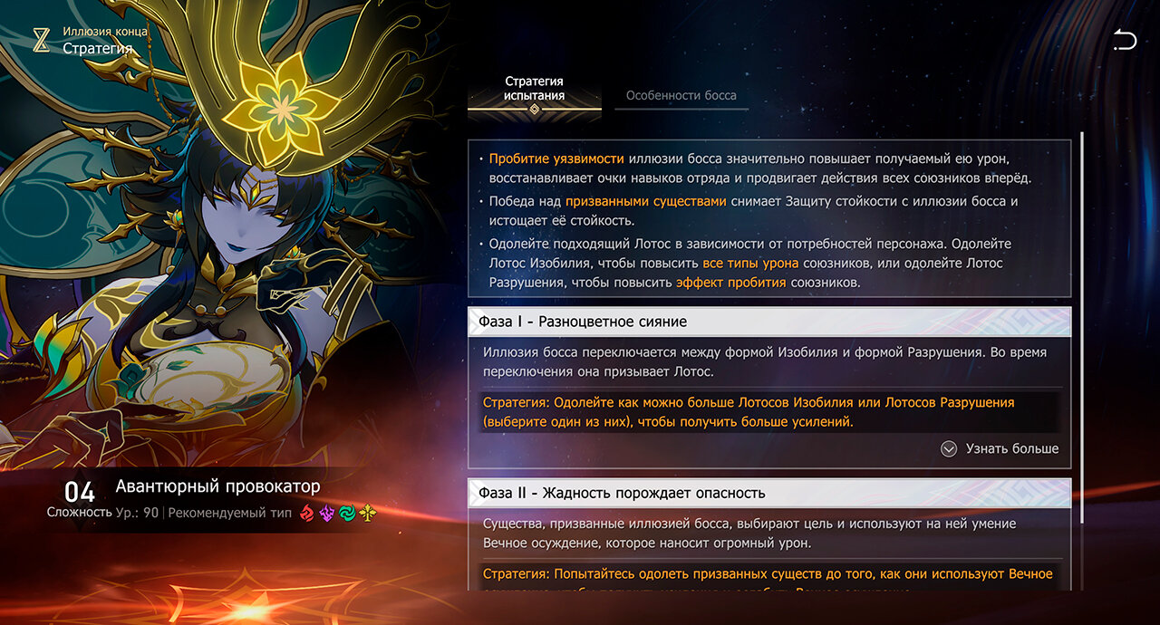 Авантюрный провокатор Фантилия – еще один давно забытый босс. Она владеет силами Изобилия и Разрушения, и в зависимости от фазы наносит ветряной или электрический урон. Как и жаложук, Фантилия умеет призывать саммонов – Лотосы. Это тоже первый приоритет, потому что пока Лотосы на поле, пробить стойкость Фантилии будет непросто. А еще они уменьшают количество очков навыков, что критично для множества команд. Босс несложный по механикам, однако она наносит огромный урон, поэтому будьте готовы к этому и возьмите в отряд вашего лучшего хилера или щитовика.