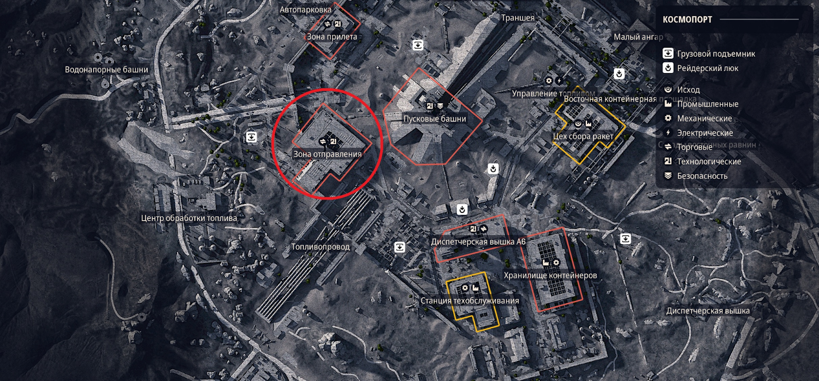 Первый этап можно выполнить на карте Космопорт, направившись к зданию вылета (Departure Building). Оно расположено ближе к центральной части локации. Чтобы сократить путь и избежать лишних столкновений, удобнее всего заходить через верхний вход с северо-восточной стороны.