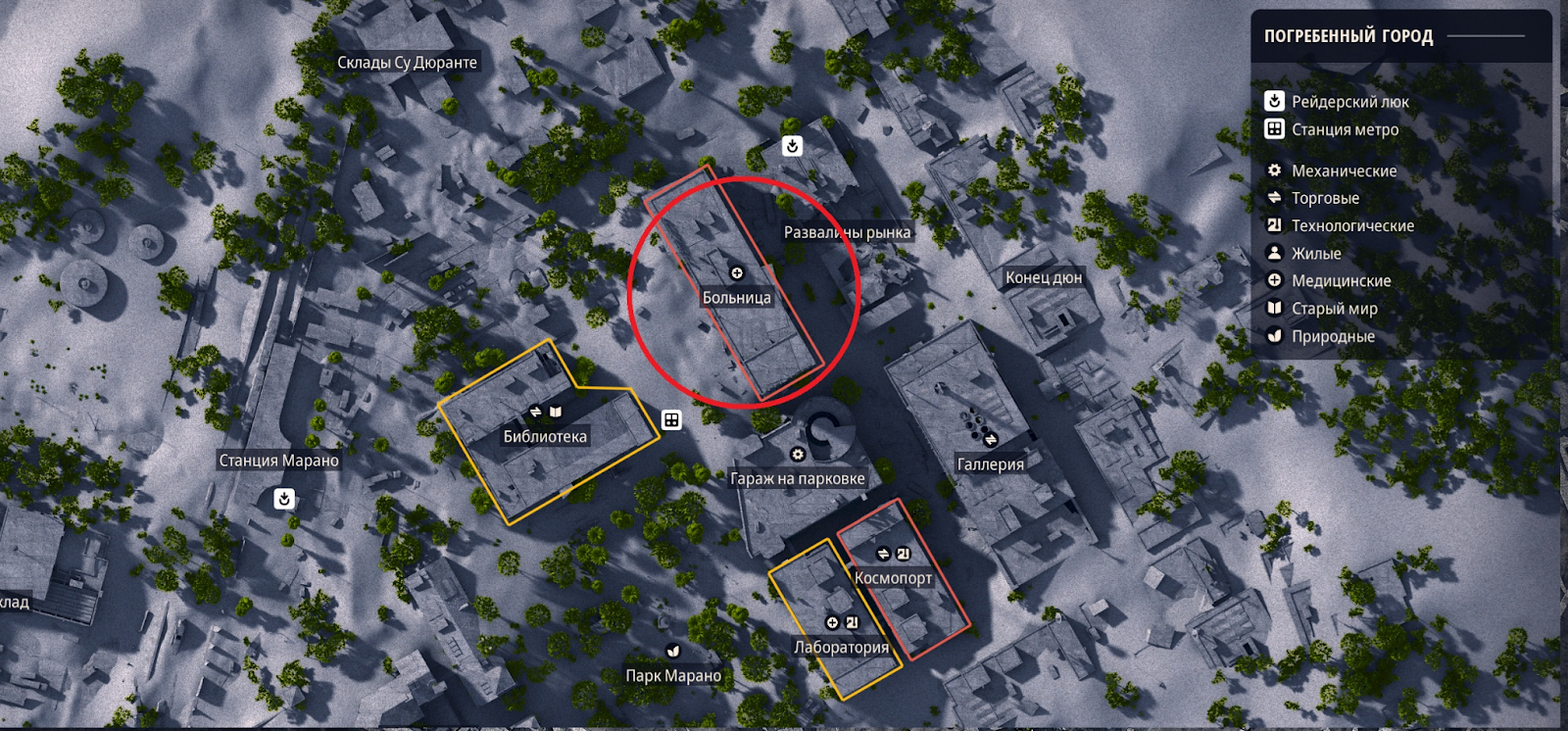 Вторая часть проходит на карте Засыпанный город (Buried City), где вам предстоит найти местную Больницу. Здание расположено рядом с парковкой, но вход может быть неочевидным. Самый простой способ попасть внутрь – воспользоваться строительными лесами с внешней стороны и подняться на нужный уровень.