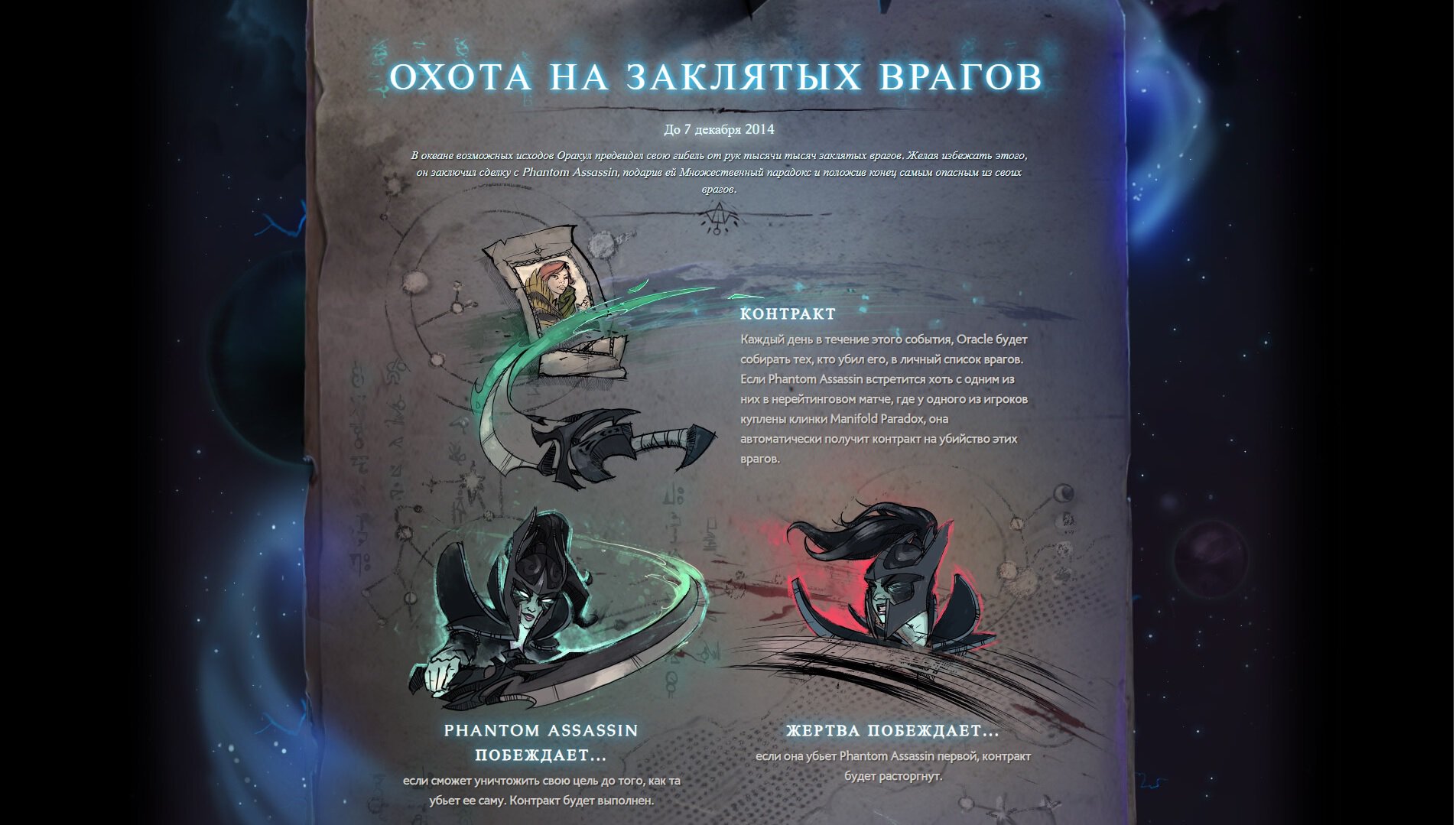 Если коротко: в начале матча Phantom Assassin получала контракт, который был виден всем участникам, на убийство одного игрока вражеской команды. Его суть: героиня должна первой устранить цель, чтобы получить награду (в случае успеха, ее зарабатывали и напарники). Если же цель контракта первой убивала Фантомку, то договор расторгался и награду получала вражеская команда. Ничего не напоминает?