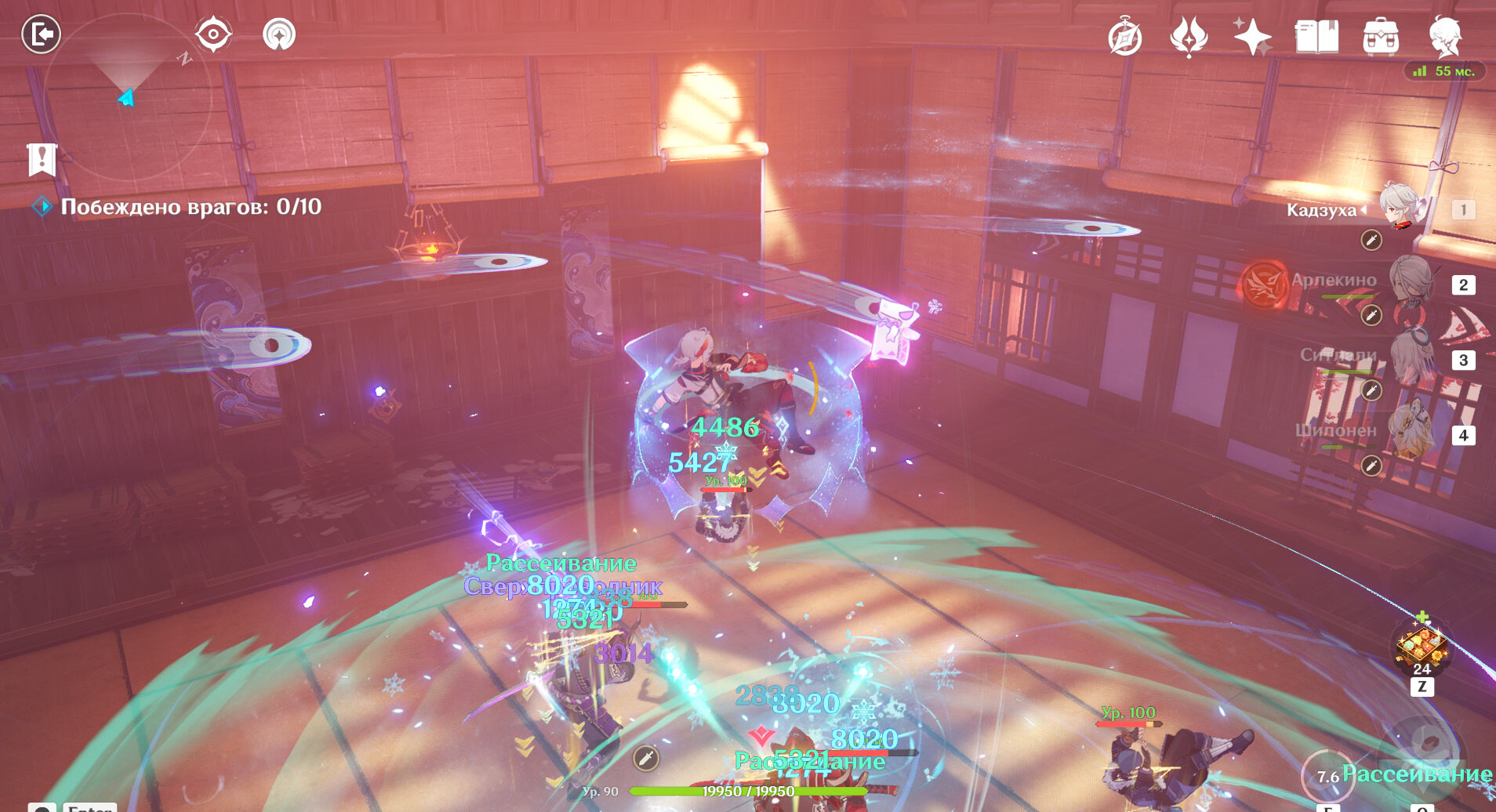 Среди врагов – два кайраги, Пиро и Электро, а также нобуси и похитители сокровищ, всего 10 человек. Лучше возьмите героев со стяжкой, чтобы можно было стянуть всю группу – Кадзуху, Венти или Сахарозу. Желательно прокачать героев до 90 уровня, как и их оружие, но ничего страшного, если 1-2 героя в отряде будут ниже уровнем – лишь бы это не был ваш основной дамагер.