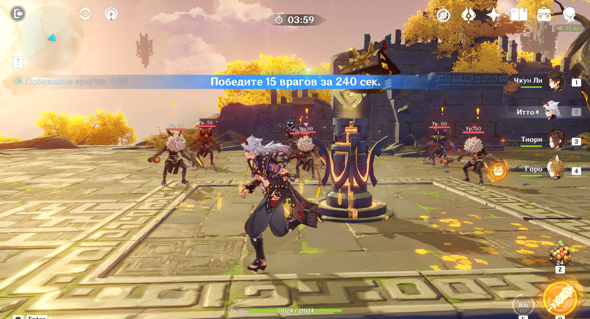 После этого активируйте механизм и поднимайтесь по появившейся дороге. Впереди ждут враги – один лавачурл с каменным панцирем, митачурл с топором, а также обычные хиличурлы и шамачурлы. На прохождение дается 4 минуты.