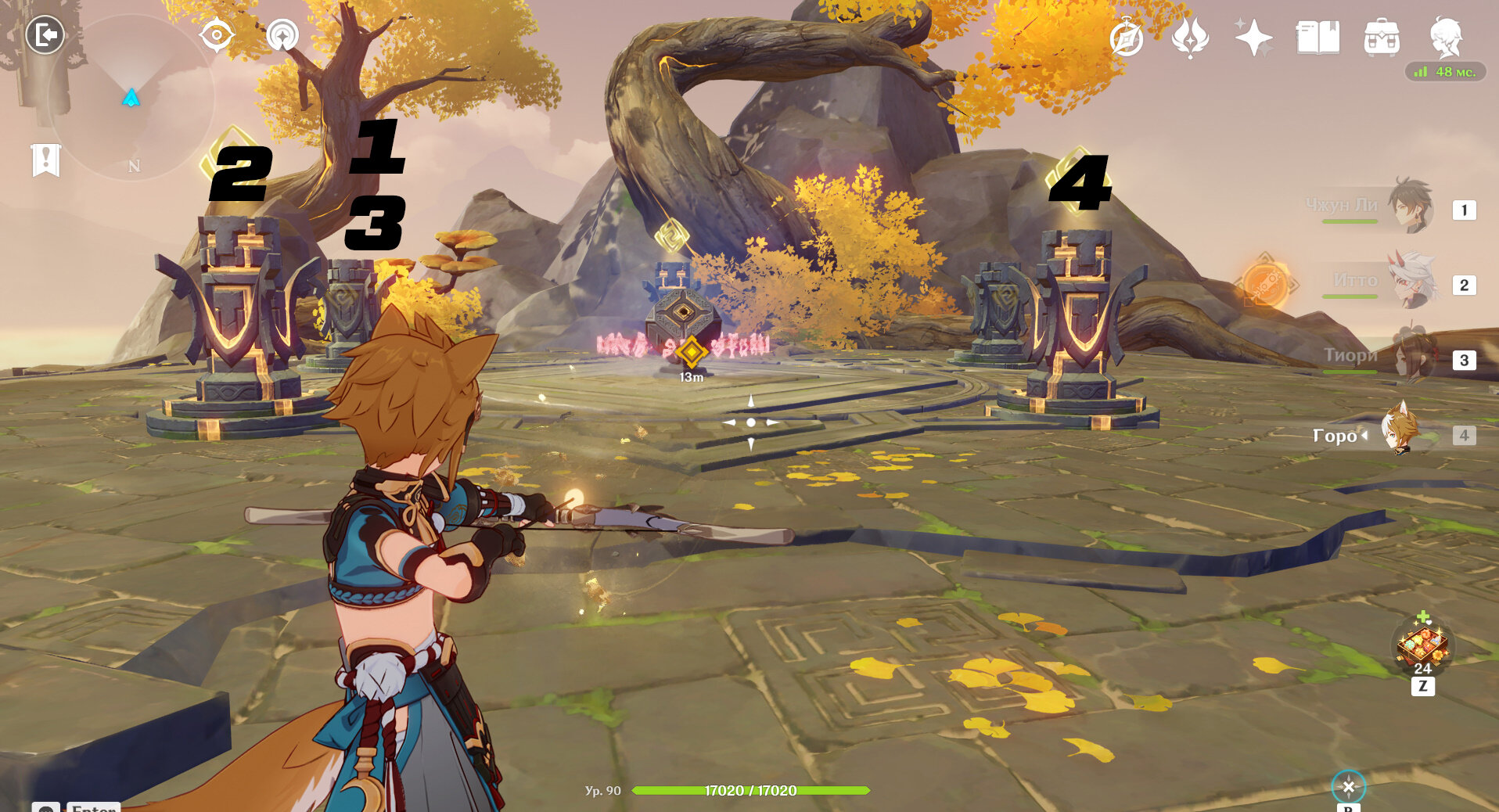 Найдите подземелье. Перед входом возьмите минимум одного Гео персонажа с быстрой инфузией – Горо, Нин Гуан, Шилонен, Качина. Из бесплатных подойдет Ноэлль, но только если вы перед входом зарядите ее ульту на максимум, чтобы использовать инфузию.