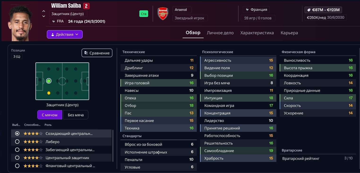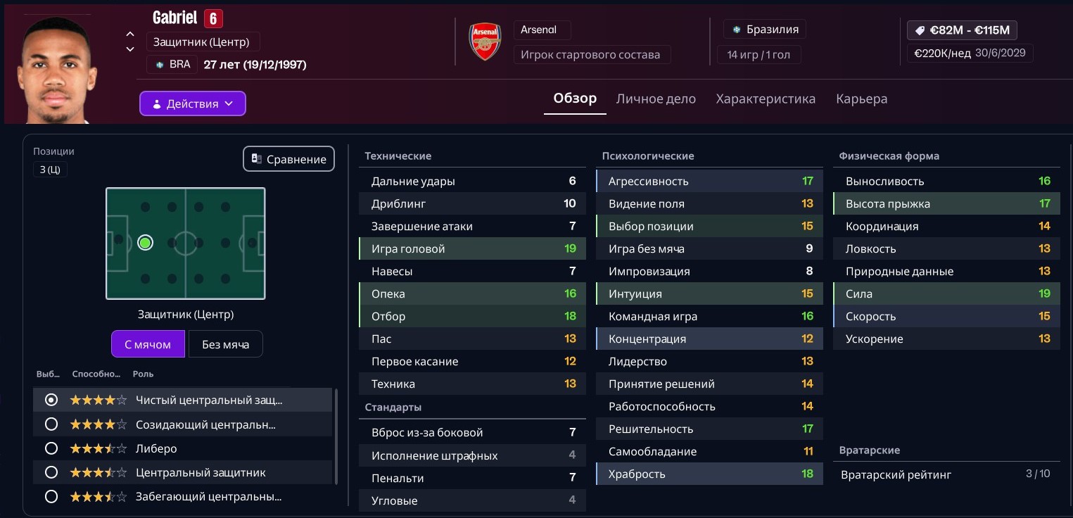 У разработчиков менеджера особый взгляд на звезд «Арсенала». Несколько лет назад Вильям Салиба считался перспективнее Габриэля Магальяэса, но сейчас именно бразилец доминирует в великолепной защите «канониров». Это признала даже аркадная FC! В FM 26 Салиба значительно сильнее Габриэля и по текущим способностям (88 против 84-х), и по потенциалу (92 против 84-х). Полный провал!