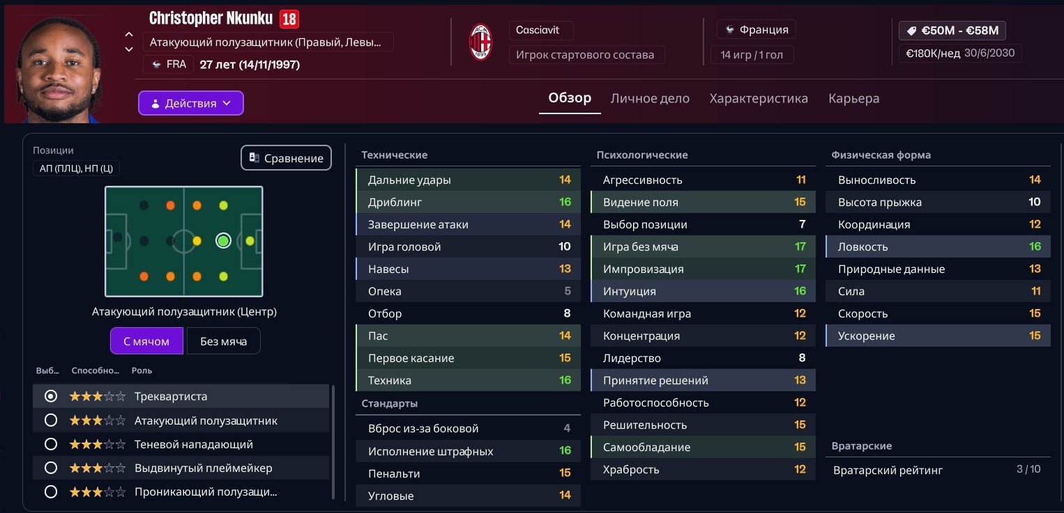 Крис Нкунку поразил болельщиков игрой за «Лейпциг» и до сих пор пользуется отголосками былой славы. «Милан» купил атакующего хавбека у «Челси» за 37 млн евро (солидный ценник для Италии), но за несколько месяцев француз так и не вписался в состав и забил лишь один гол ножницами в Кубке. В менеджере Нкунку до сих пор котируется на уровне Эберечи Эзе, Бриана Мбемо и Ойана Сансета (по 78). Но на поле между ними пропасть.