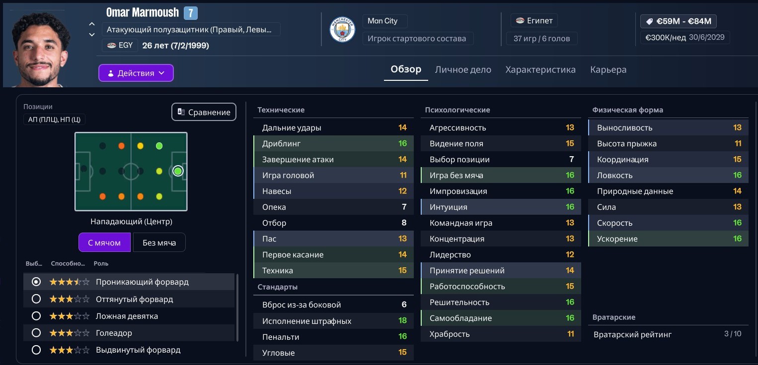 Омар Мармуш – загадка для болельщиков. Египтянин провел великолепные полгода за «Айнтрахт» и уже зимой уехал в «Сити», но в Англии стал дублером Эрлинга Холанда – поначалу забивал, а теперь выглядит хуже Жереми Доку. В менеджере Мармуш получил рейтинг 82 и обошел несколько видных бомбардиров – Серу Гирасси (81), Виктора Дьокереша и опального Виктора Осимхена (по 80). Не слишком ли большой аванс для 26-летнего нападающего?