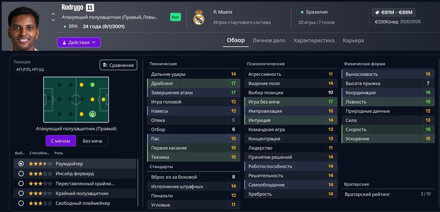 Родриго остался сильным игроком в FM, хотя в реальном футболе у него проблемы. Вингер никак не воспользовался крупным спадом Винисиуса в конце прошлого сезона, а при Хаби Алонсо обычно начинает игры на лавке «Реала». Последний раз Родриго забивал за клуб еще в марте! Можете поверить, что в менеджере он завершает на 17, обладает крепкой психикой, а по актуальному рейтингу 83 находится наравне с Джамалем Мусиалой и Ламином Ямалем?