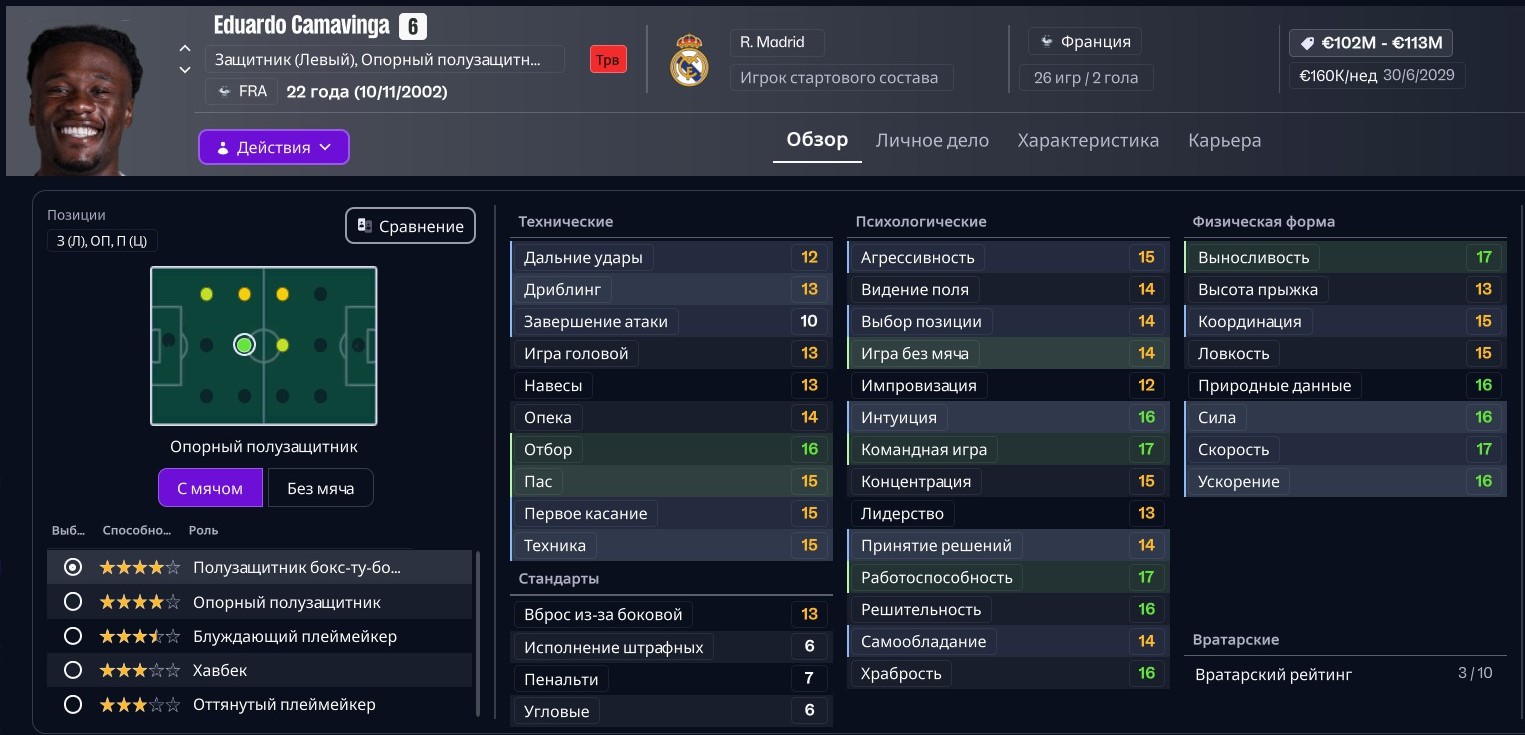 Еще один загадочный игрок мадридцев – Эдуардо Каваминга. Техничный француз считался большим вундеркиндом и перебрался в «Реал» в 2021 году, но с тех пор его прогресс сильно замедлился. При Карло Анчелотти хавбек смирился с ролью в ротации и даже выходил слева в защите, а его ценник на Transfermarkt обрушился в два раза – со 100 до 50 млн евро. Sports Interactive все еще считает Камавинга крутым универсалом и поставила француза выше Мойсеса Кайседо (85 против 83-х).