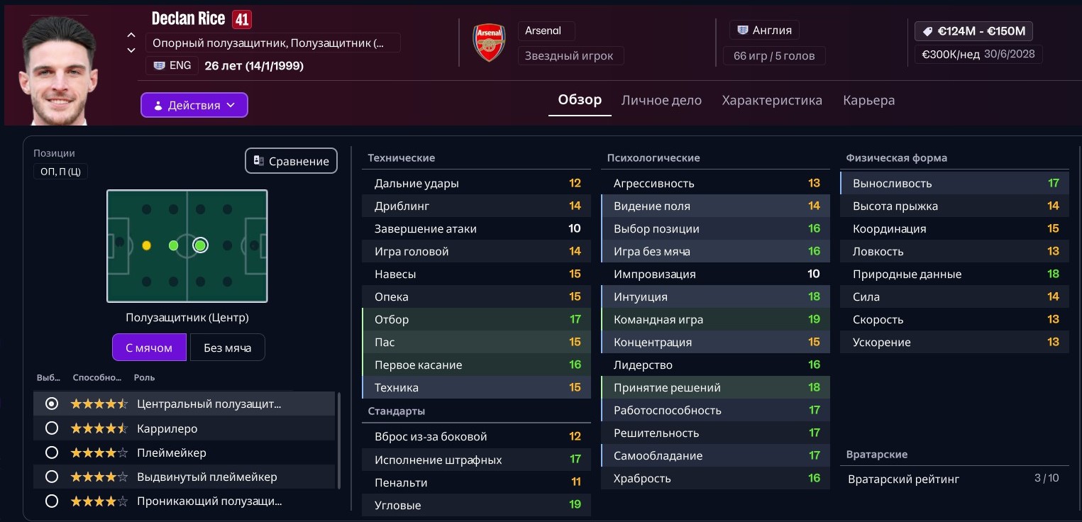Деклан Райс сильно вырос за последние годы. Англичанин прибавил в атакующих скиллах и лидерских качествах, а широкой аудитории запомнился его дубль «Реалу» в прошлом розыгрыше ЛЧ. Деклан в огне, но считаете ли вы его лучшим хавбеком мира? FM26 положительно ответил на вопрос и поставил Райса рядом с Джудом Беллингемом (91) – выше Родри (90), Витиньи и Педри (по 88). Еще больше удивляет, что молодой испанец не догоняет англичанина по потенциалу (90). Очень-очень спорно.