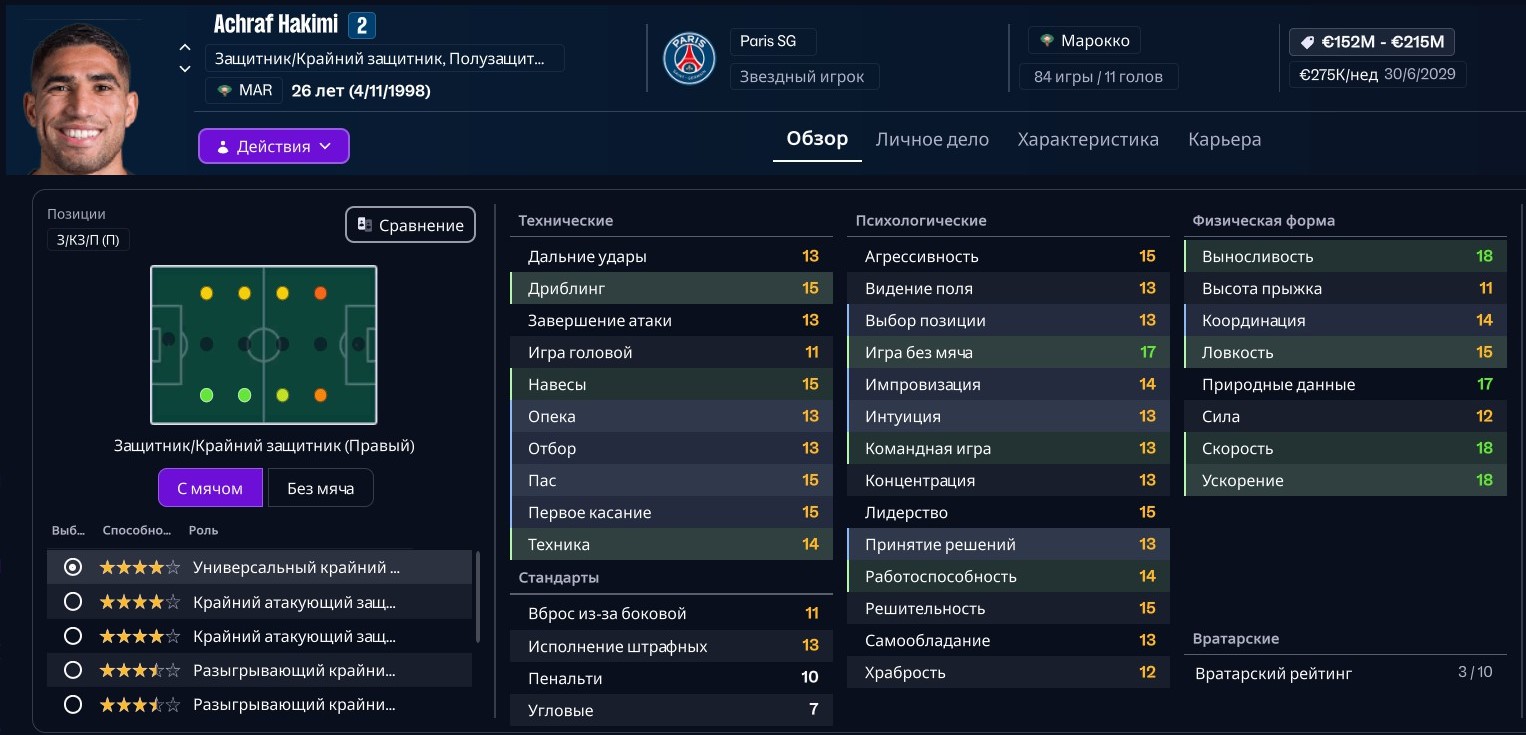 Футболисты «ПСЖ» получили высокие рейтинги в FM26. Ашраф Хакими не стал исключением и возглавил топ чистых правых защитников (лучше только Йозуа Киммих), но получил совсем уж невзрачные характеристики. В них нет яркого атакующего игрока, которого мы увидели в прошлом сезоне. Среди топовых скиллов – скорость, выносливость да игра без мяча. Между тем у Жоау Канселу в Саудовской Аравии сразу пять «зеленых» технических умений.