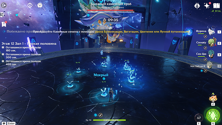 Лунная Бутонизация работает особенно удобно. Навык Лаумы, если дать его в центр арены, активирует сразу шесть семян, что сбивает краба за секунды. Если не успеть активировать семена вовремя, босс применит атаку, которая почти гарантированно ваншотает активного персонажа. После падения краб остается оглушенным примерно 4 секунды, затем сопротивления возвращаются в норму.