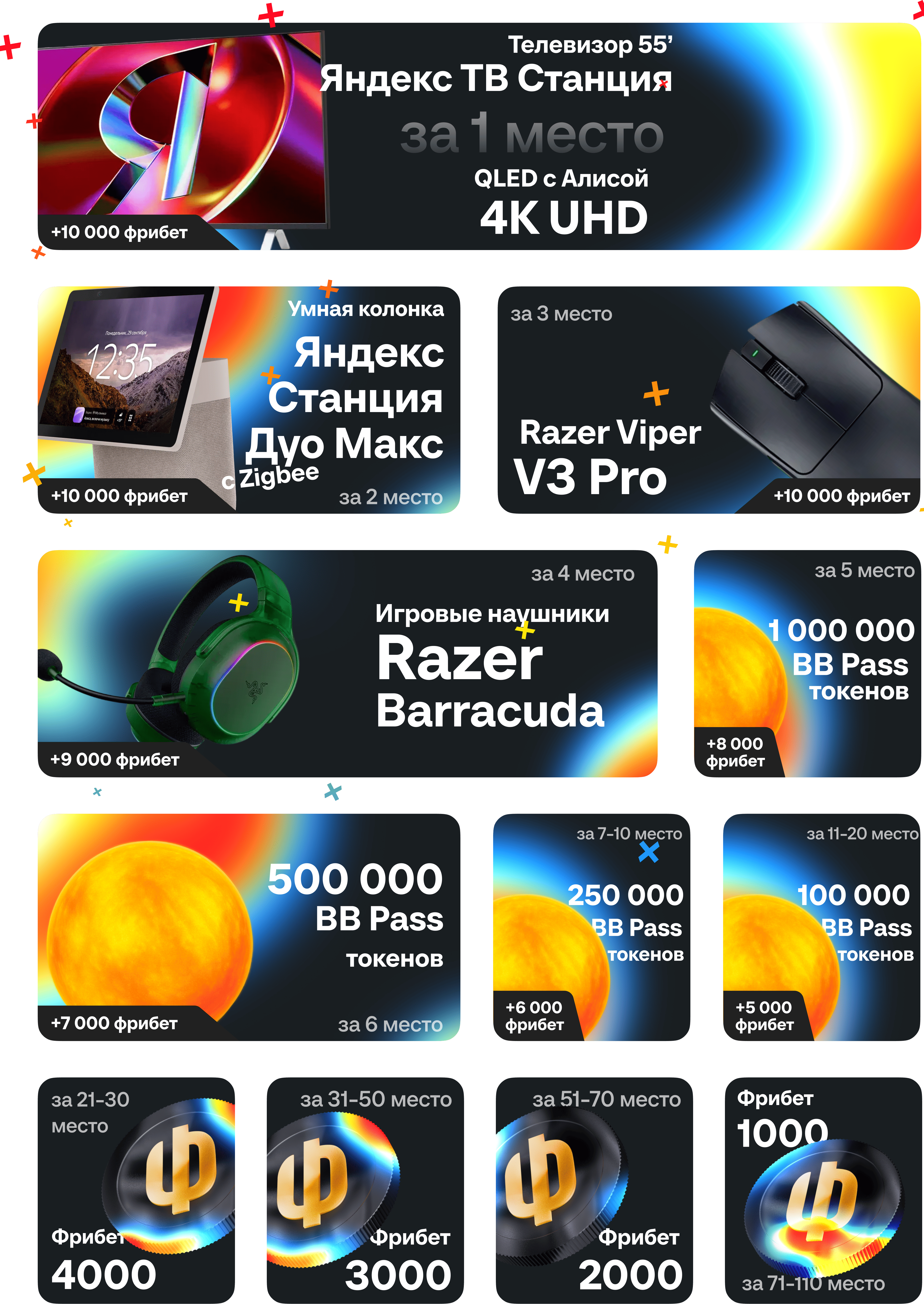 5-е место: 1 000 000 токенов в BetBoom Pass + фрибет на 8000;