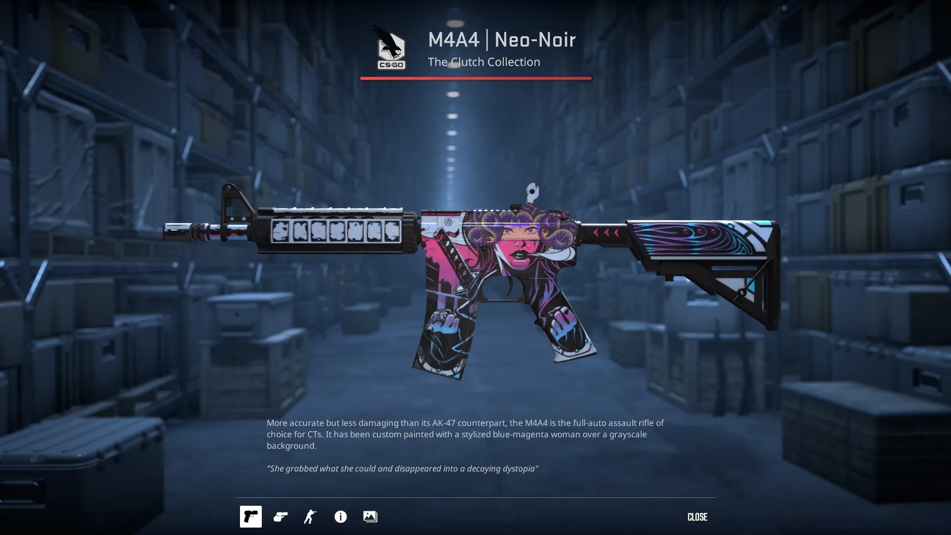 M4A4 | Неонуар тоже может стать холстом для творчества. Например, если использовать наклейку «Влюбленные глаза» и 4 копии наклейки «Василиск», чтобы сделать волосы, на скине появится Медуза Горгона.