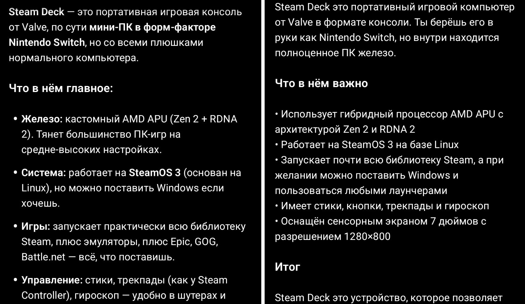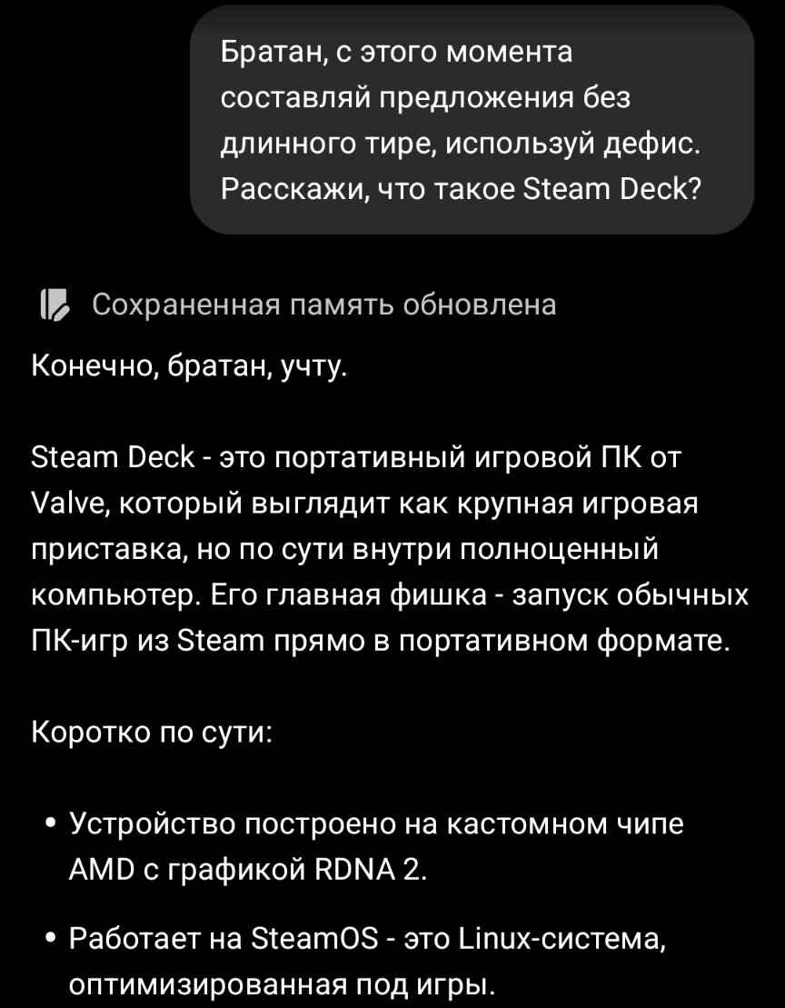 Нажмите на кнопку «Сохранить» и переходите в чат для проверки. Для примера мы вновь попросили рассказать про Steam Deck.