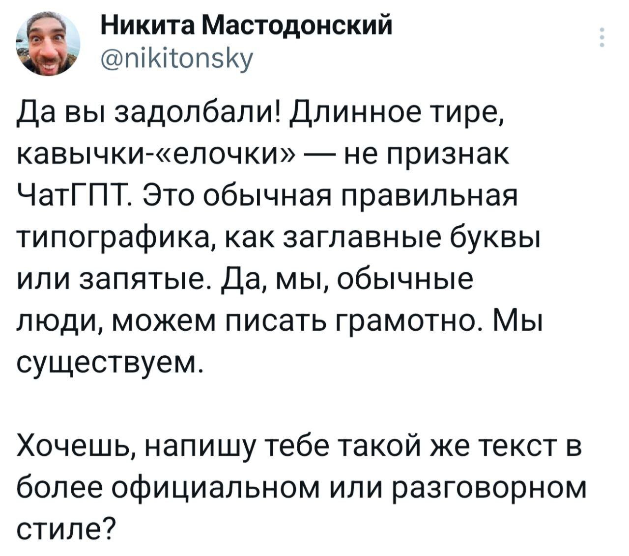 Длинный тире придумала не нейросеть. Она обучается на громадном массиве информации (книги, журналы, статьи), написанным человеком по правилам и нормам грамматики. Проще говоря, чат-бот лишь имитирует принятые литературные нормы, потому длинные тире не являются надежным доказательством использования ИИ. И все же пользователей раздражало, что ChatGPT был не способен избегать этого символа даже при соответствующей просьбе.